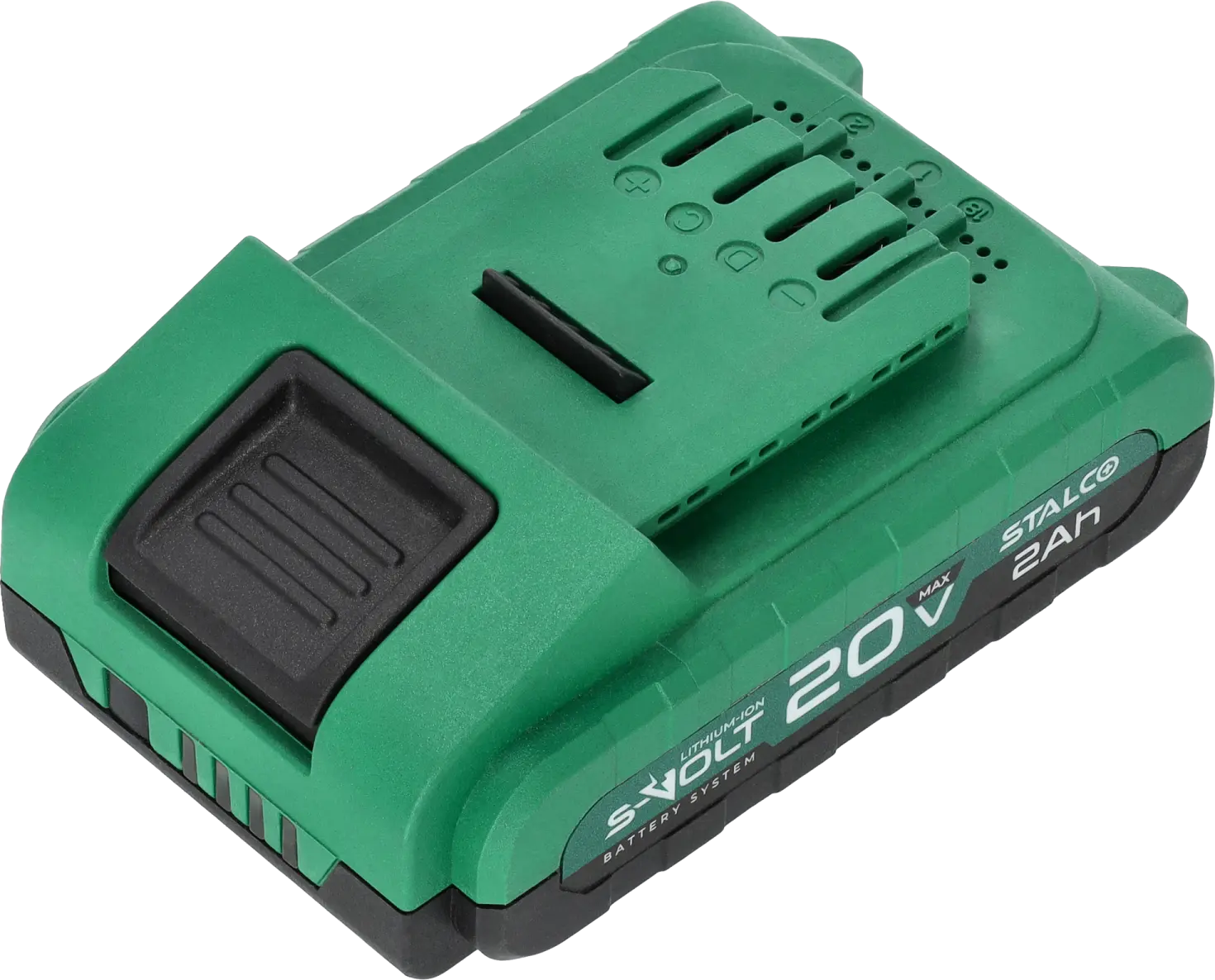 Built-in protection systems prevent overheating, overloading, and deep discharge, allowing the battery to maintain long-term efficiency and reliability. The S-Volt 20V 2Ah battery is equipped with ventilation openings that help maintain optimal operating temperature during use. A battery charge indicator allows convenient monitoring of remaining power, which is especially useful during long working sessions. The durable housing protects the battery against mechanical damage, making it suitable for demanding construction-site conditions.