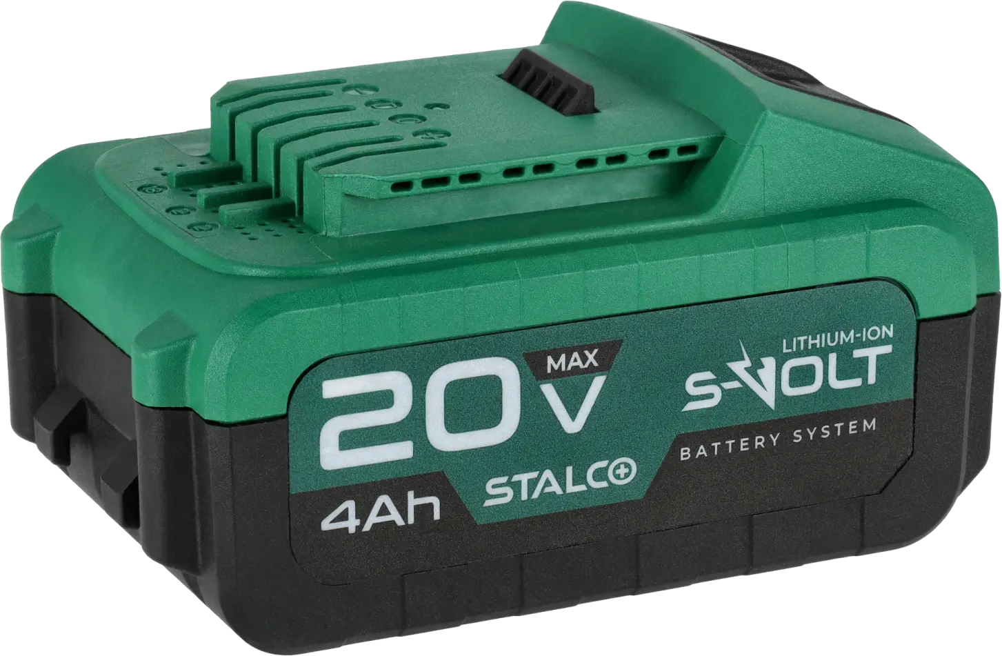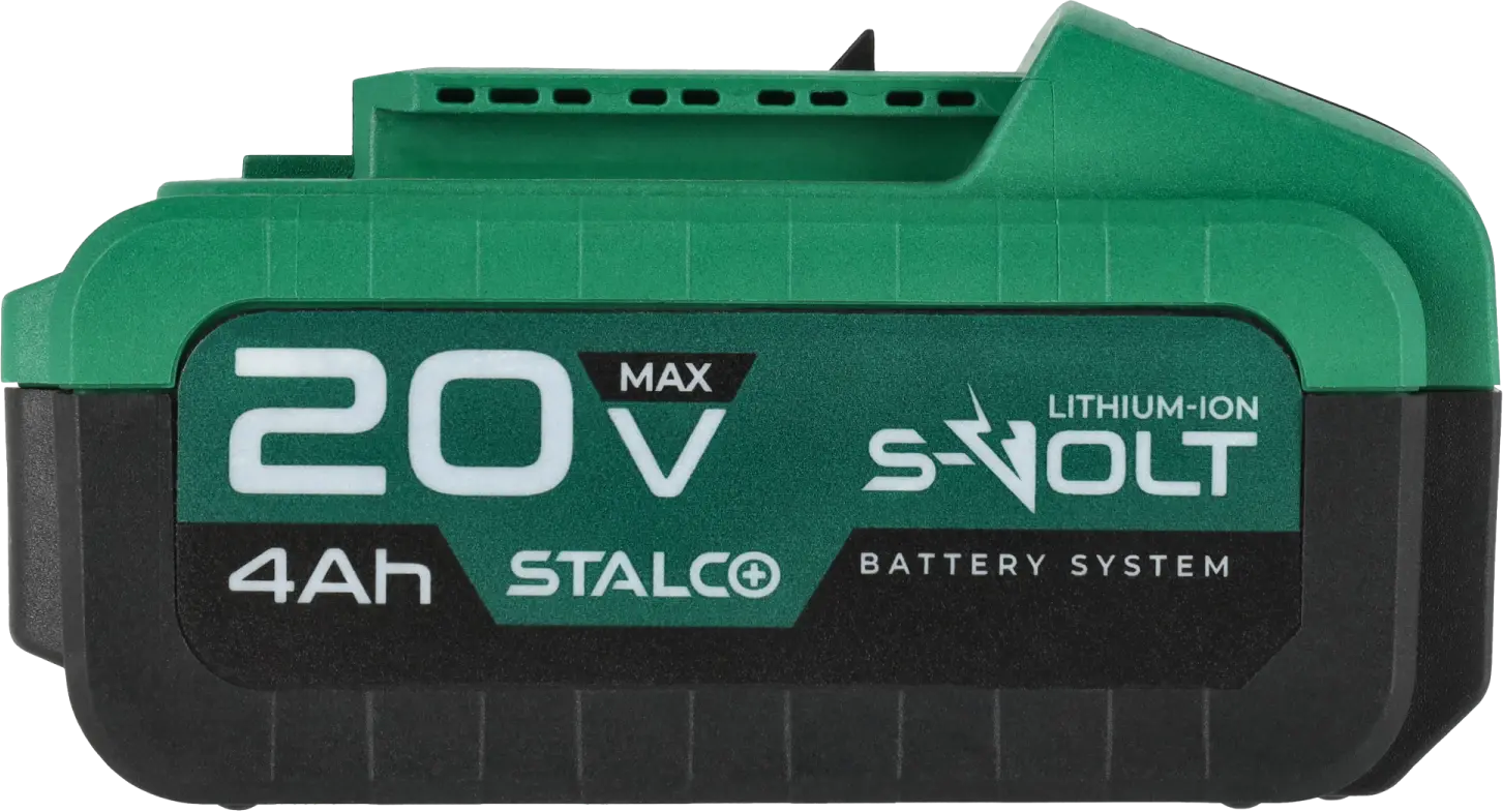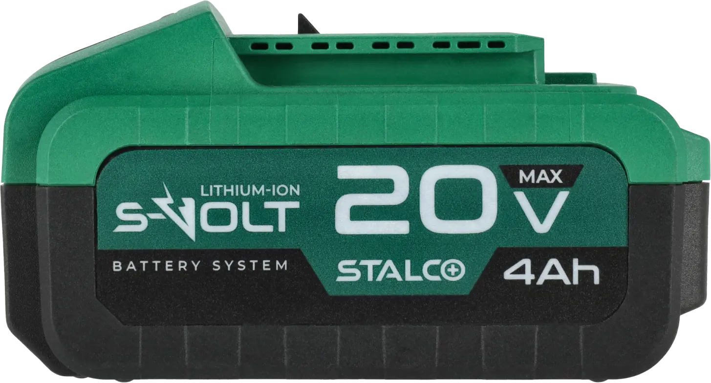 The 20V 4Ah STALCO battery is fully compatible with the S-Volt system and offers high durability combined with user convenience. The housing is made of hard, impact-resistant plastic that protects the battery from mechanical damage. Integrated ventilation openings support effective cooling during operation. Despite its high capacity, the battery remains lightweight, helping to reduce the overall weight of the tool.