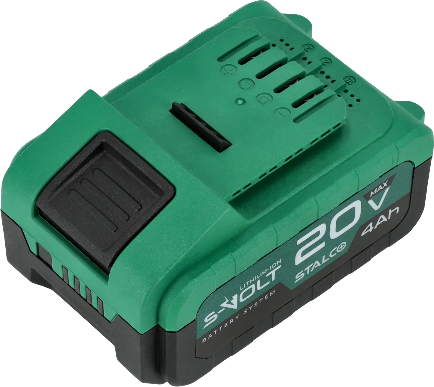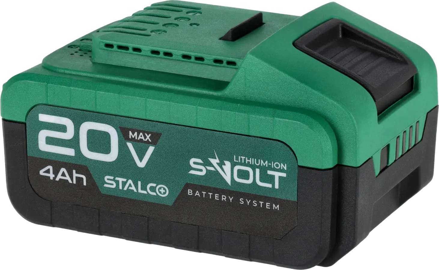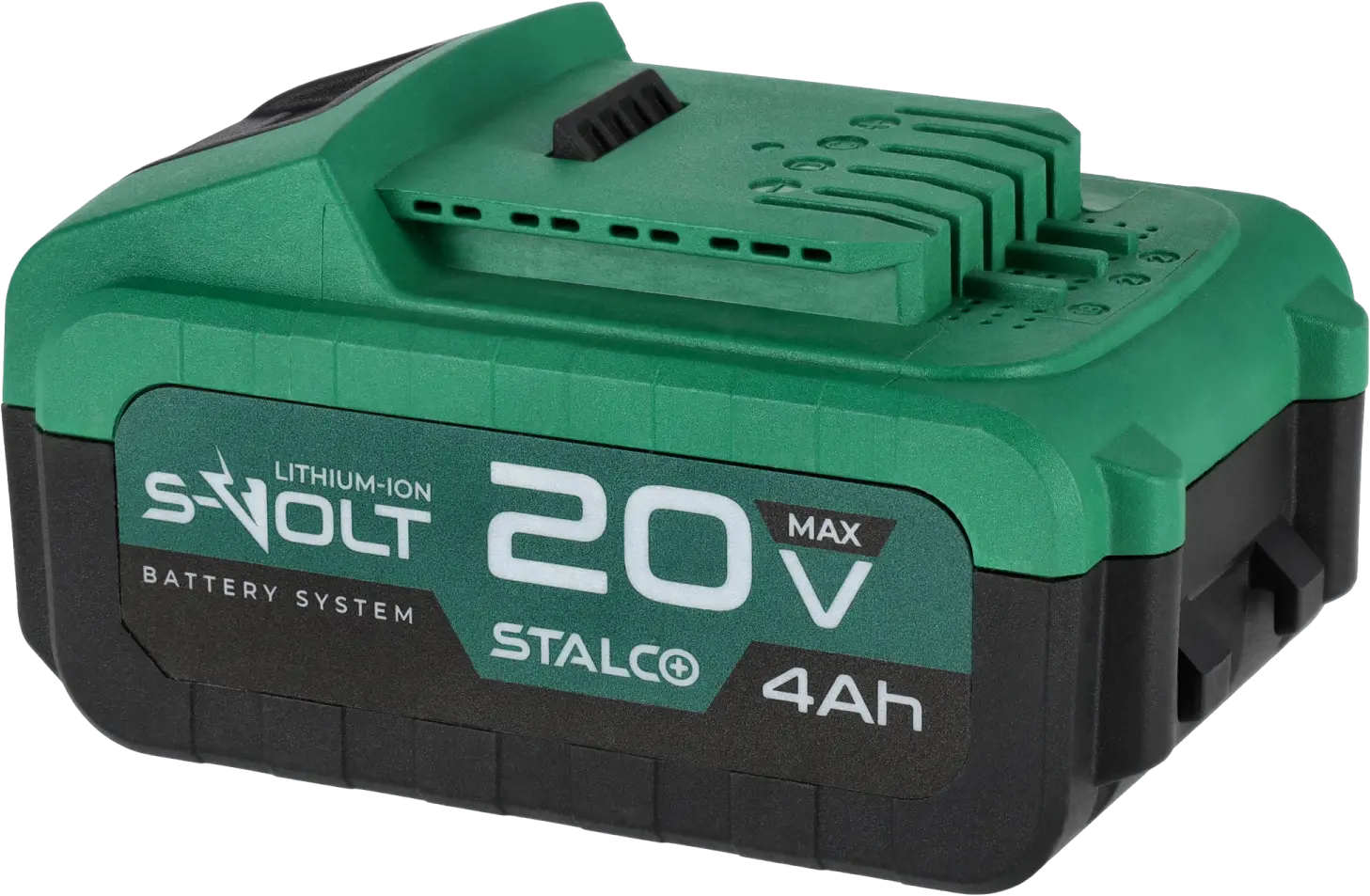 The 20V 4Ah STALCO battery is fully compatible with the S-Volt system and offers high durability combined with user convenience. The housing is made of hard, impact-resistant plastic that protects the battery from mechanical damage. Integrated ventilation openings support effective cooling during operation. Despite its high capacity, the battery remains lightweight, helping to reduce the overall weight of the tool.