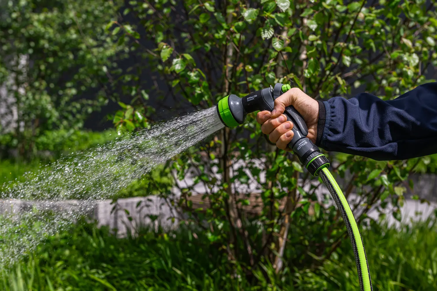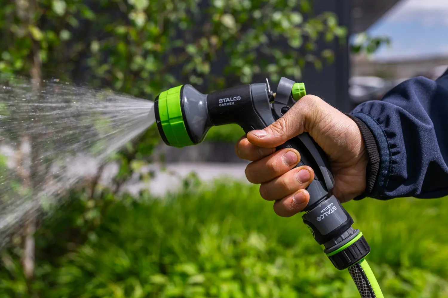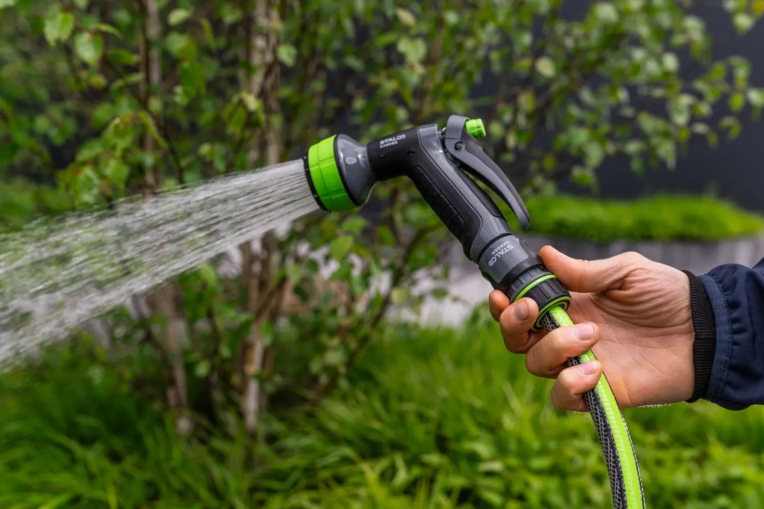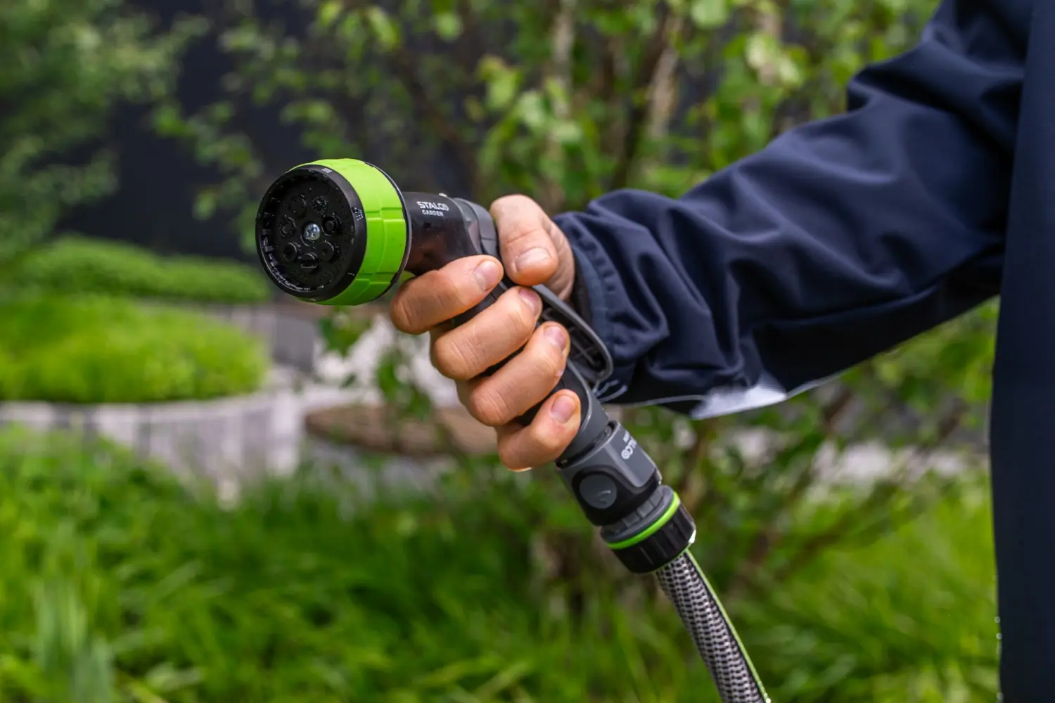 Hand-held, multi-functional sprinkler device with universal use. In the garden for watering and sprinkling plants.