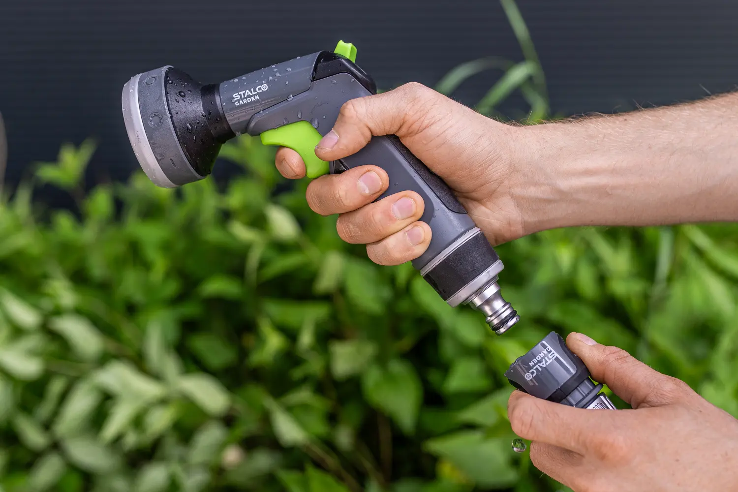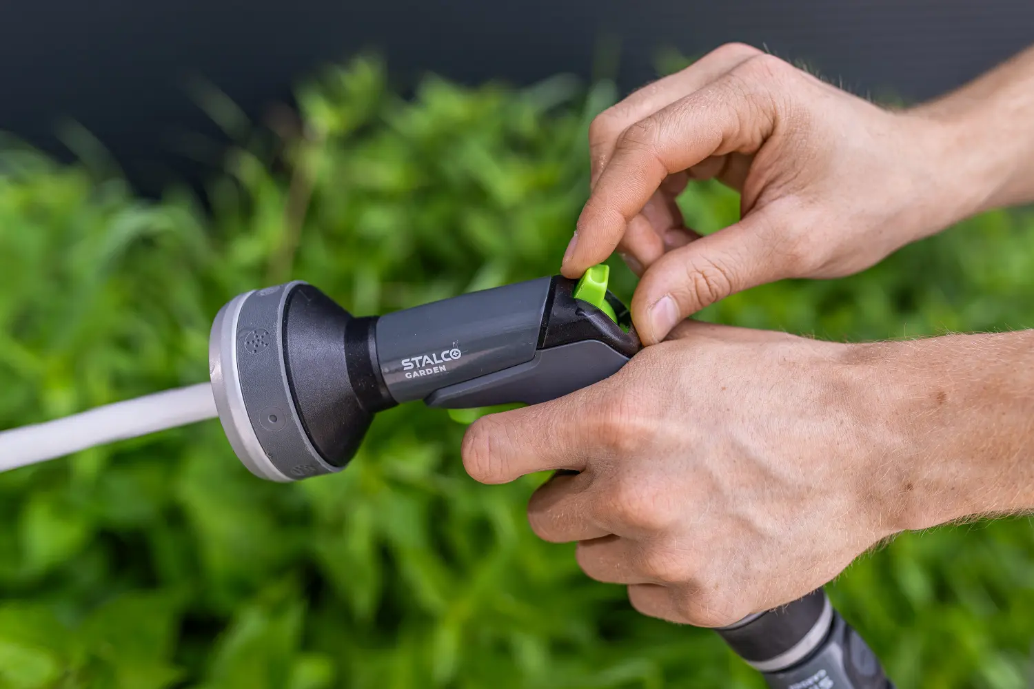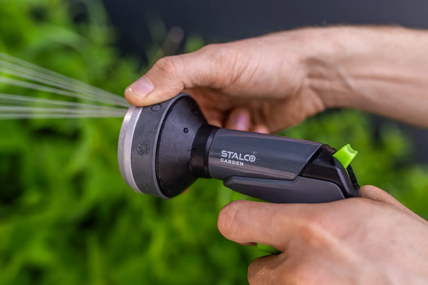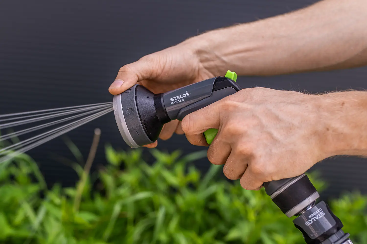 Hand-held, multi-functional sprinkler device for universal use. In the garden for watering and sprinkling plants.