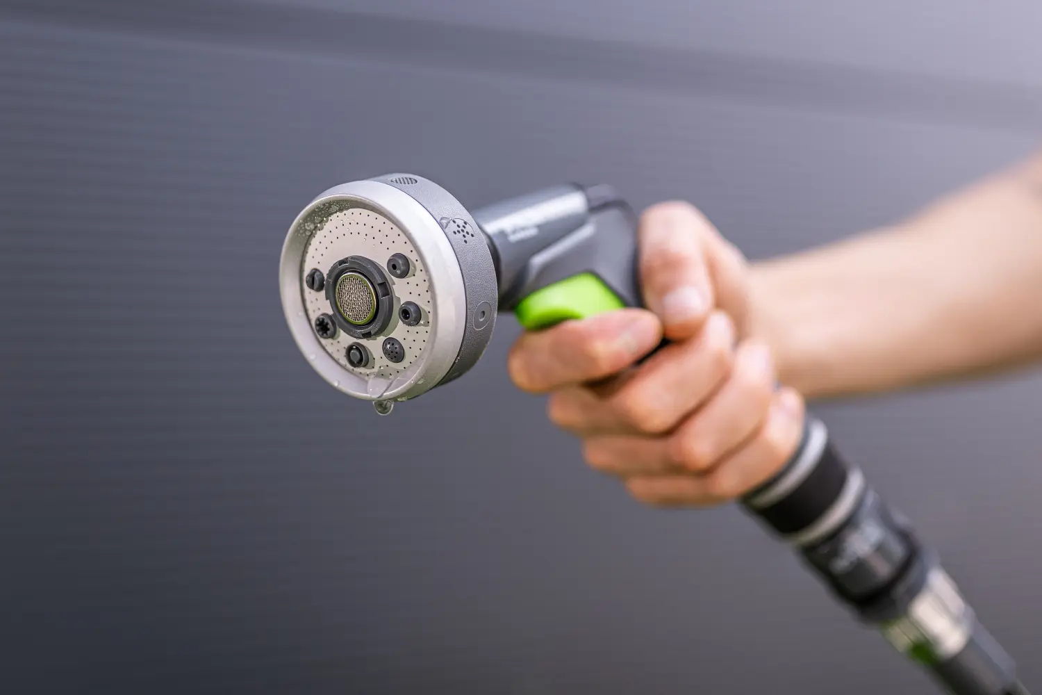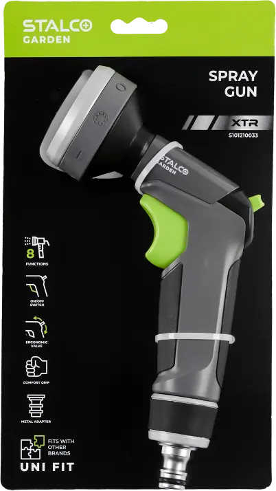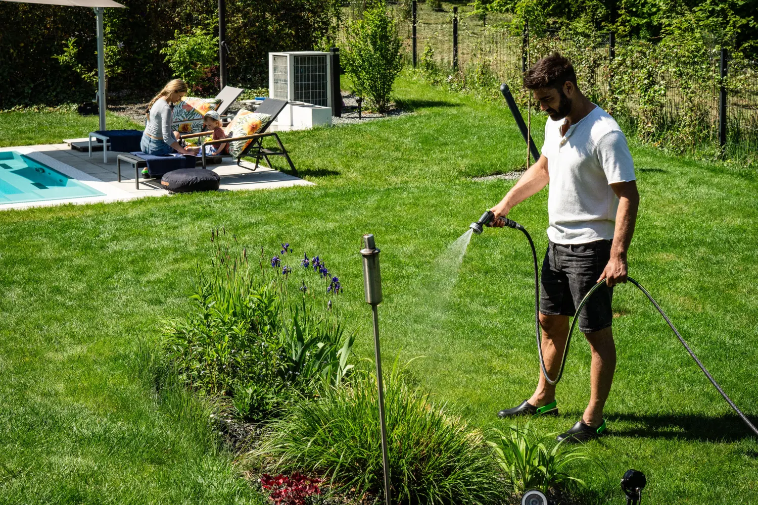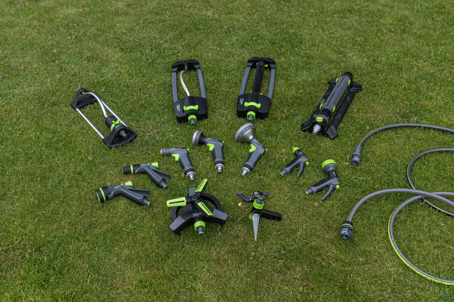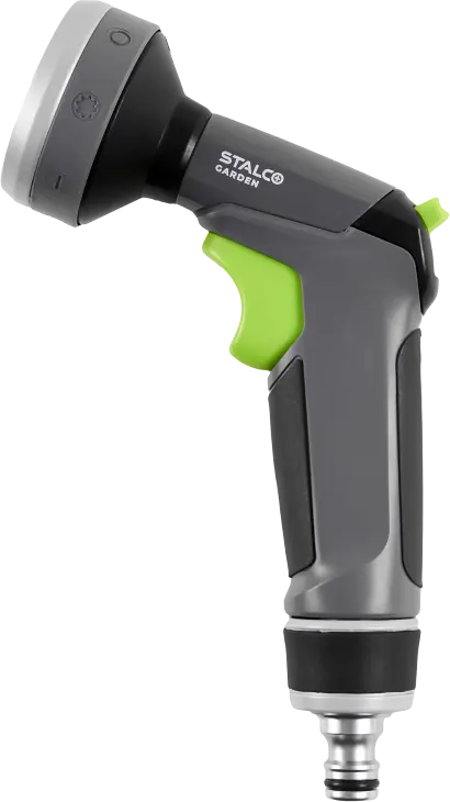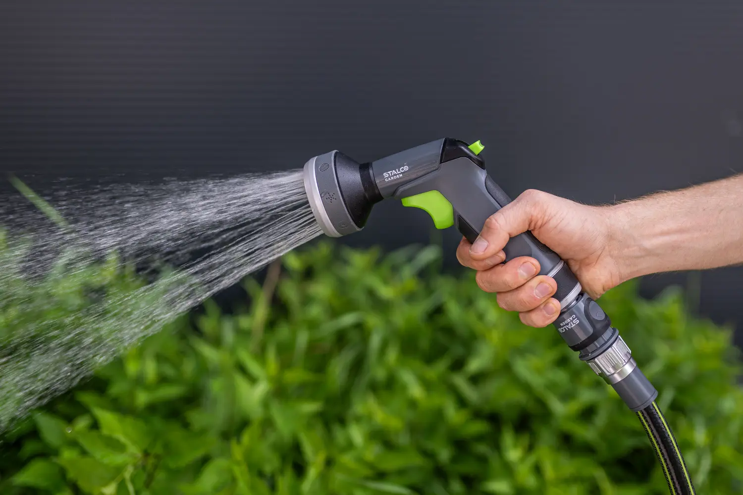Hand-held, multi-functional sprinkler device for universal use. In the garden for watering and sprinkling plants.