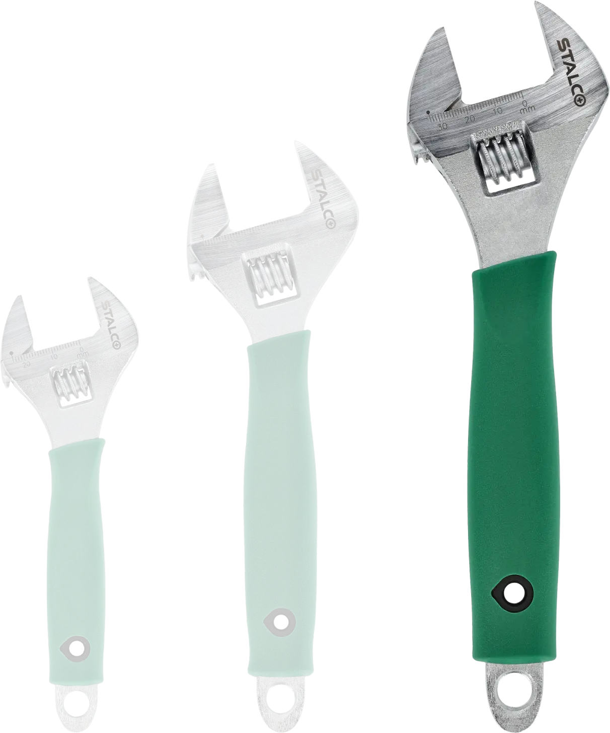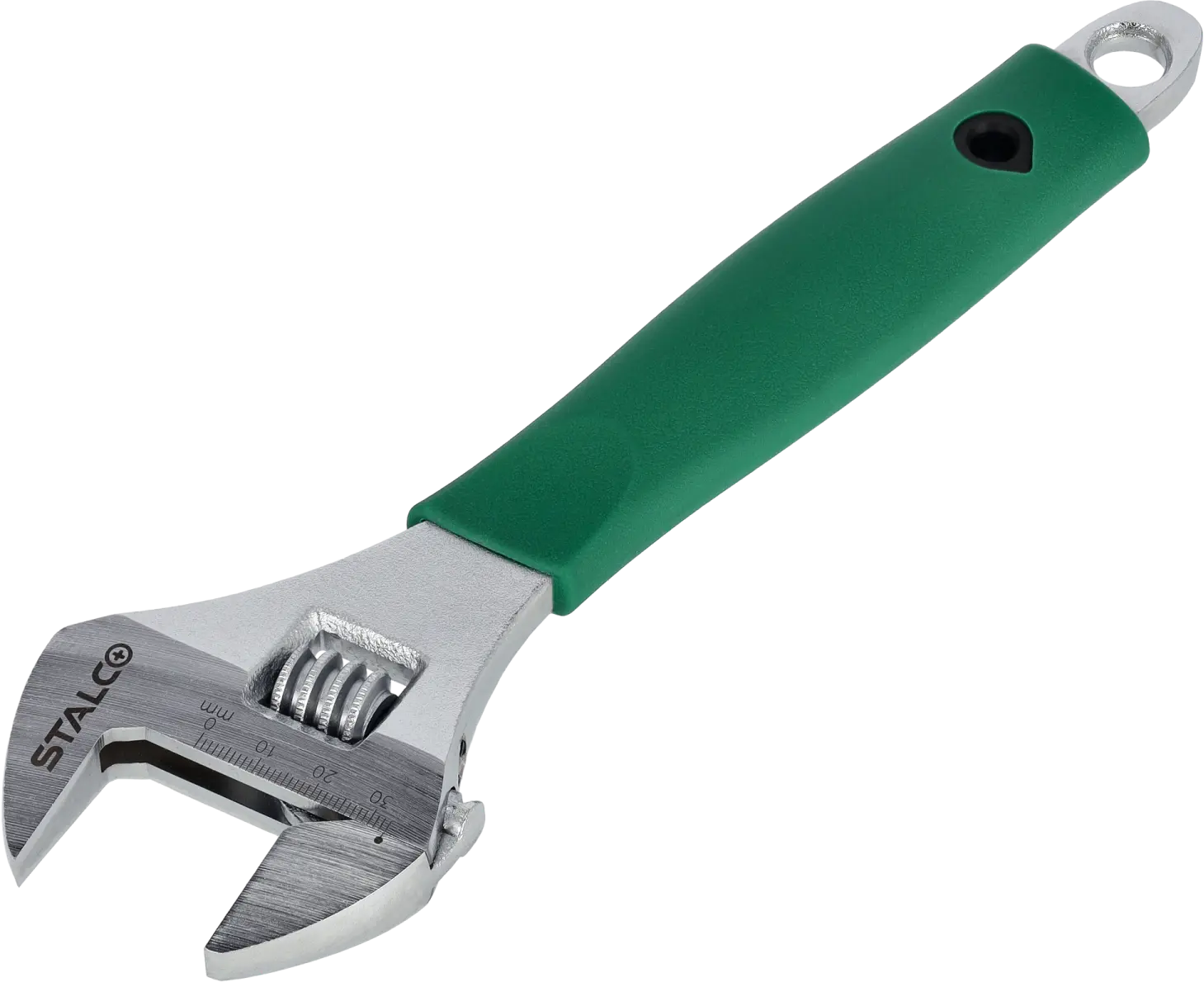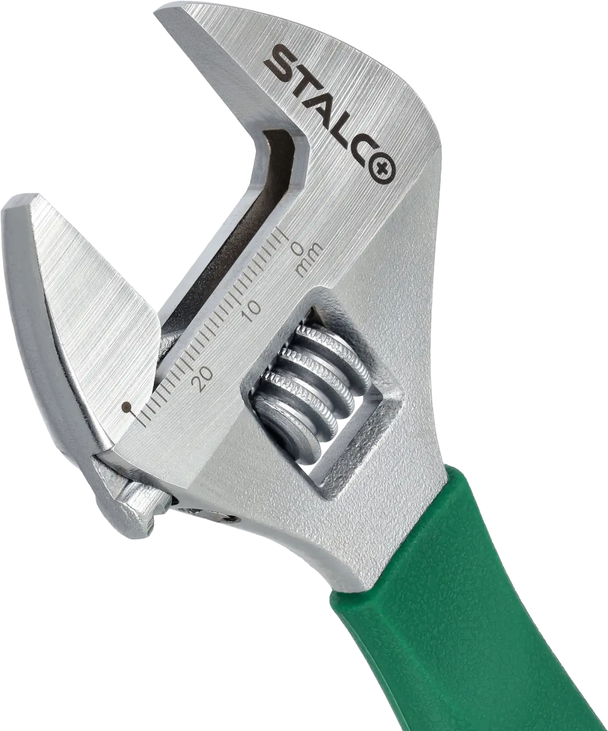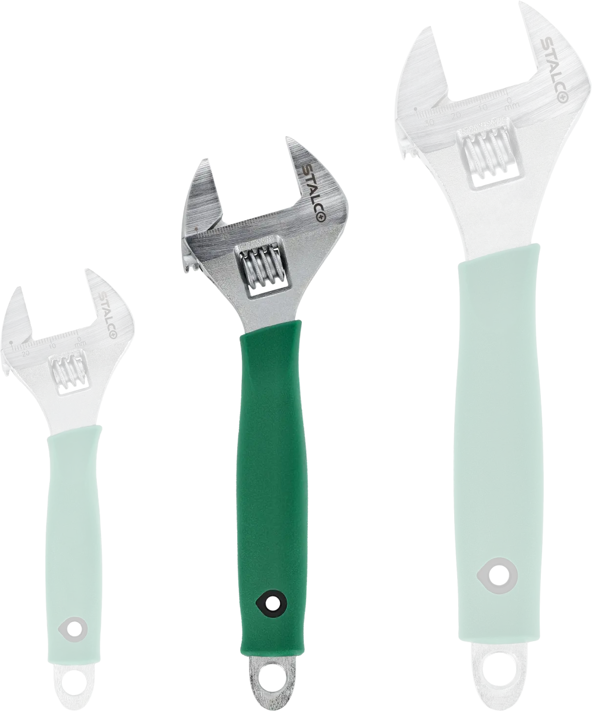 An adjustable wrench is one of the most basic hand tools. It is useful for installation, assembly, repairs, and many emergency situations. A distinctive feature is the jaw operated by a worm gear mechanism. This mechanism allows for varying the spacing between the jaws and gripping screws of various sizes. The STALCO adjustable wrench is also effective for loosening screws with worn edges. The tool is made of CrV tool steel. The soft plastic handle allows for a secure and comfortable grip during work. The STALCO product range includes three wrenches in different sizes, each with different shank lengths and varying maximum jaw spacing.