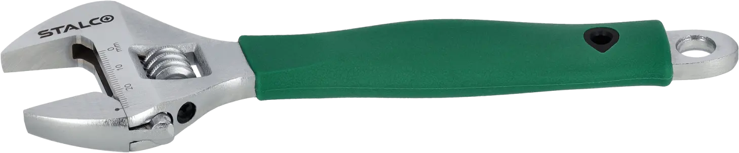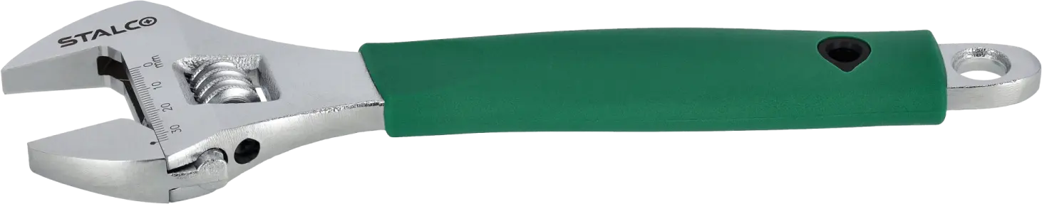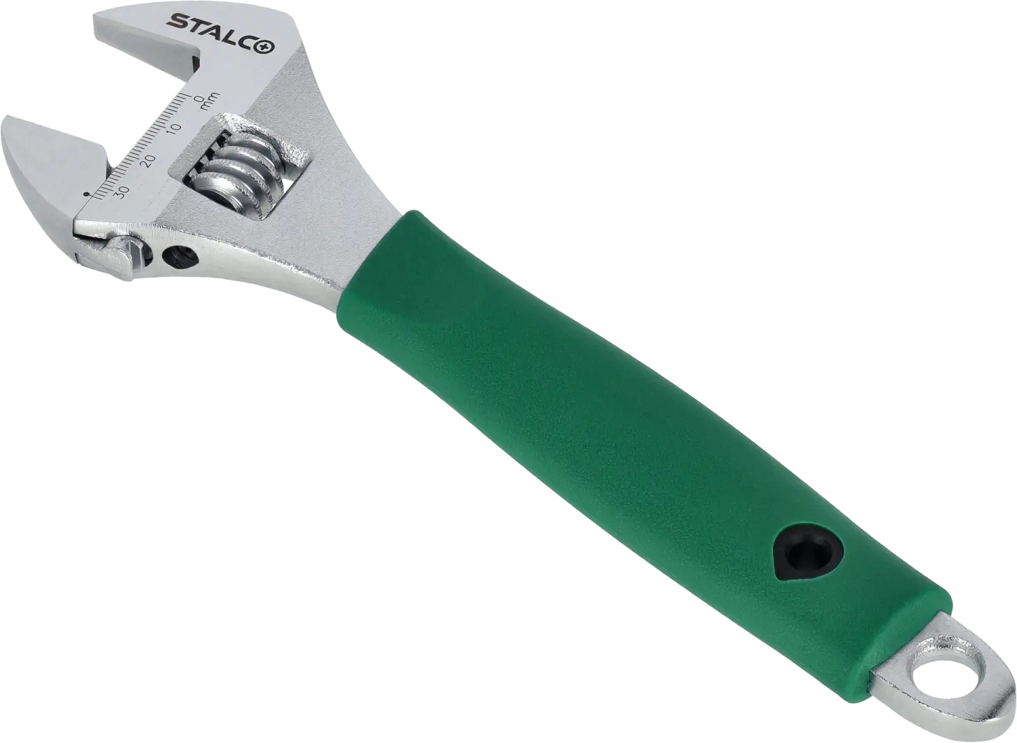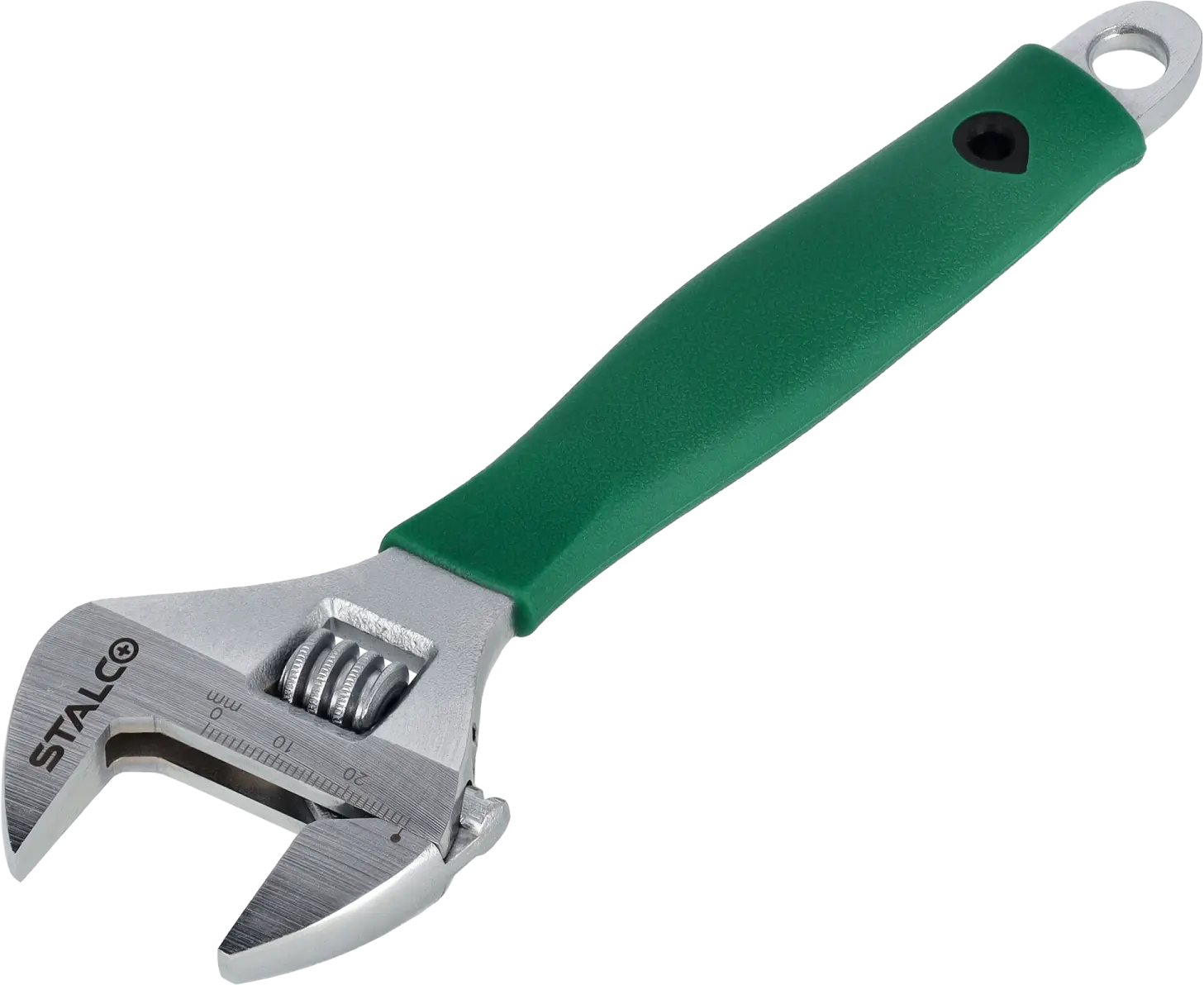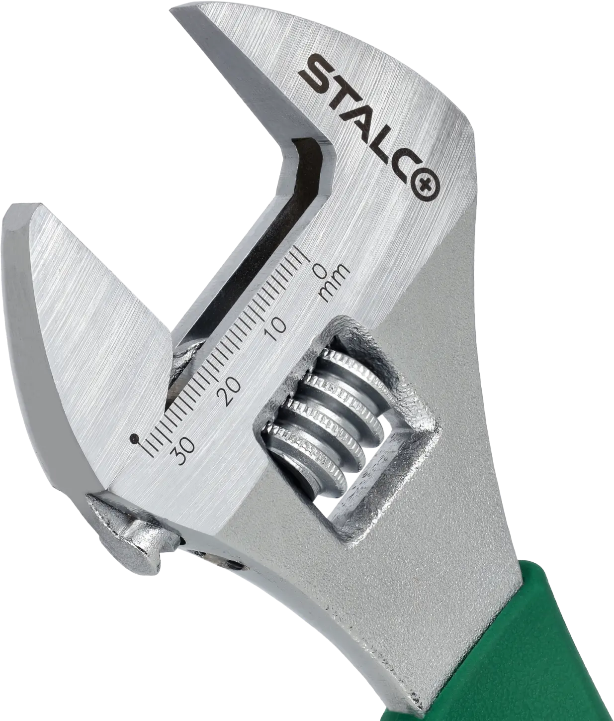 An adjustable wrench is one of the most basic hand tools. It is useful for installation, assembly, repairs, and many emergency situations. A distinctive feature is the jaw operated by a worm gear mechanism. This mechanism allows for varying the spacing between the jaws and gripping screws of various sizes. The STALCO adjustable wrench is also effective for loosening screws with worn edges. The tool is made of CrV tool steel. The soft plastic handle allows for a secure and comfortable grip during work. The STALCO product range includes three wrenches in different sizes, each with different shank lengths and varying maximum jaw spacing.