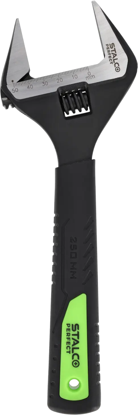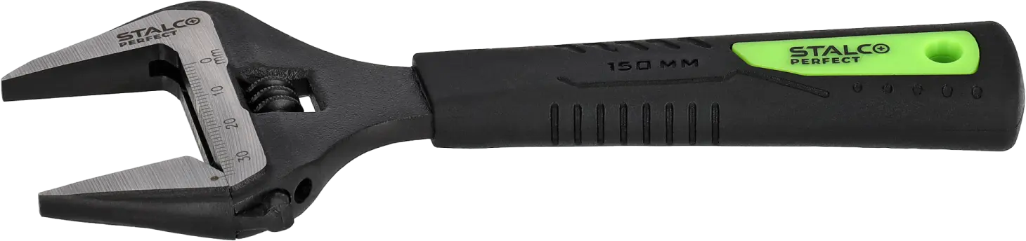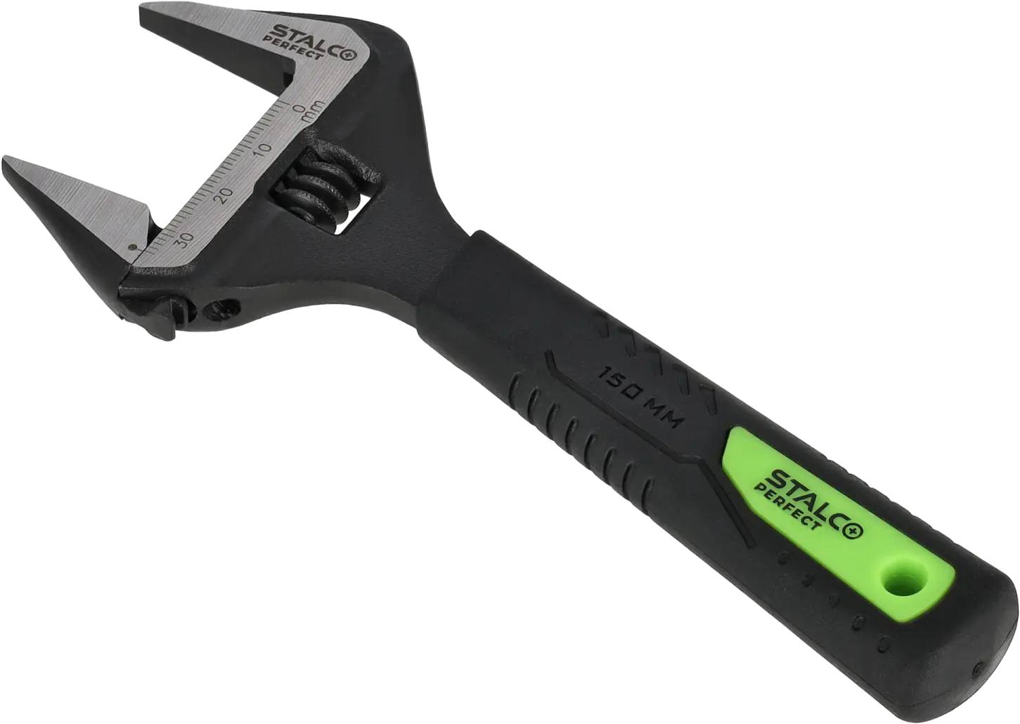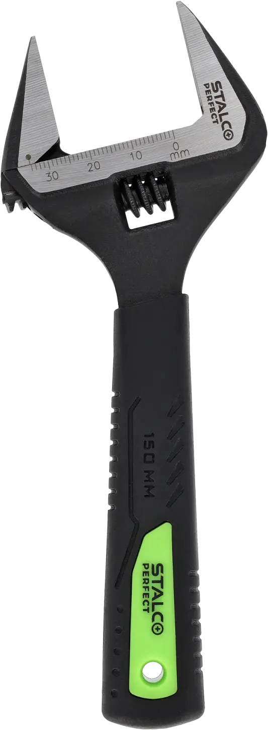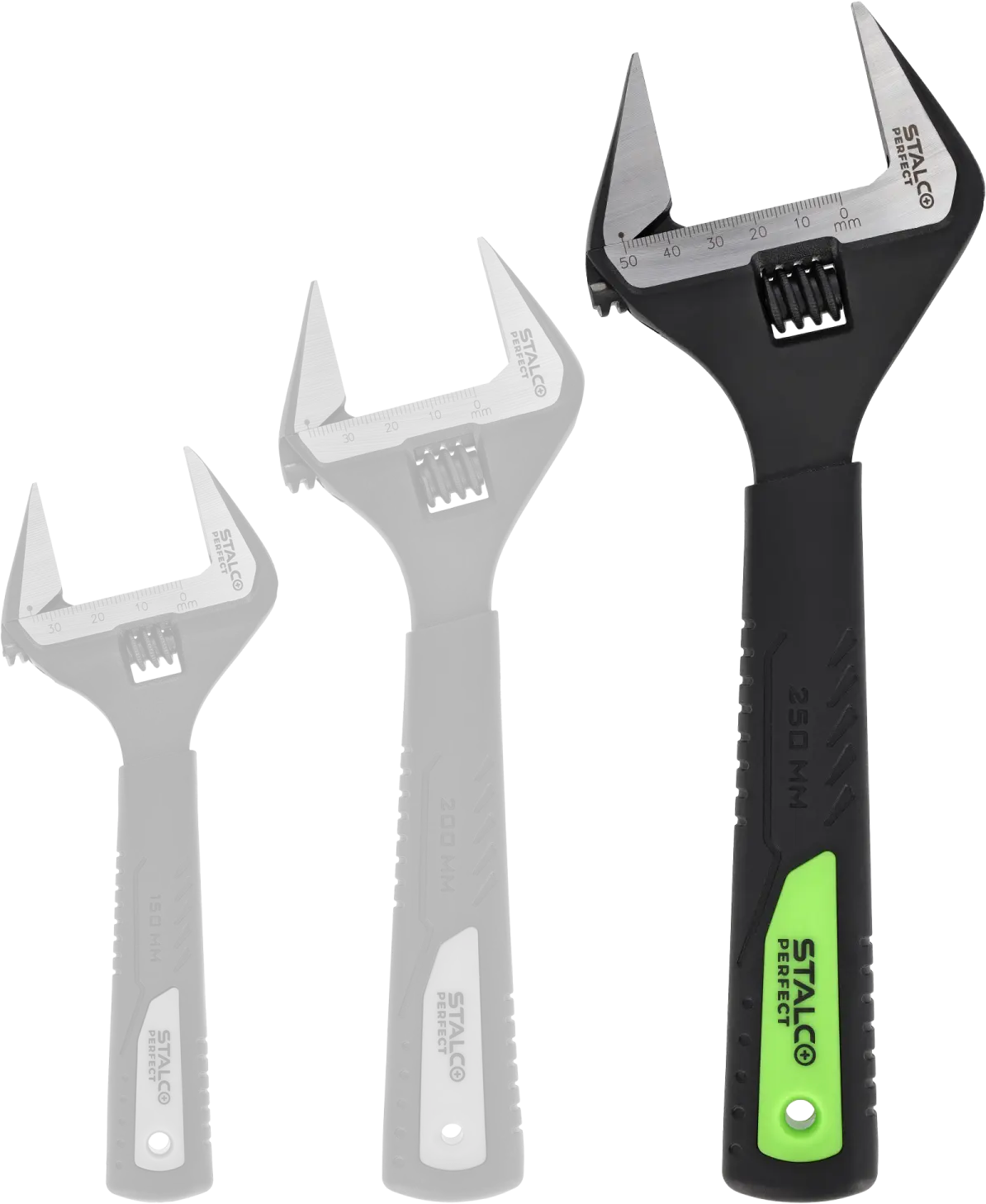 An adjustable wrench is a highly functional hand tool. It is useful for construction, mechanical, and installation work. It can be used on various types of threaded connections. A distinctive feature is the ability to change the jaw spacing. This allows the tool to be adapted to different nut sizes and also facilitates work on components with worn edges. The 150 mm adjustable wrench from the STALCO PERFECT line is equipped with a worm mechanism for adjusting the spacing. A clear vernier scale allows for quick assessment of the spacing. The ergonomic, plastic-coated handle allows for a secure grip. The entire tool is durable and resistant to harmful external factors. STALCO offers three different variants of this type of adjustable wrench. The products differ in the jaw spacing range and handle length.