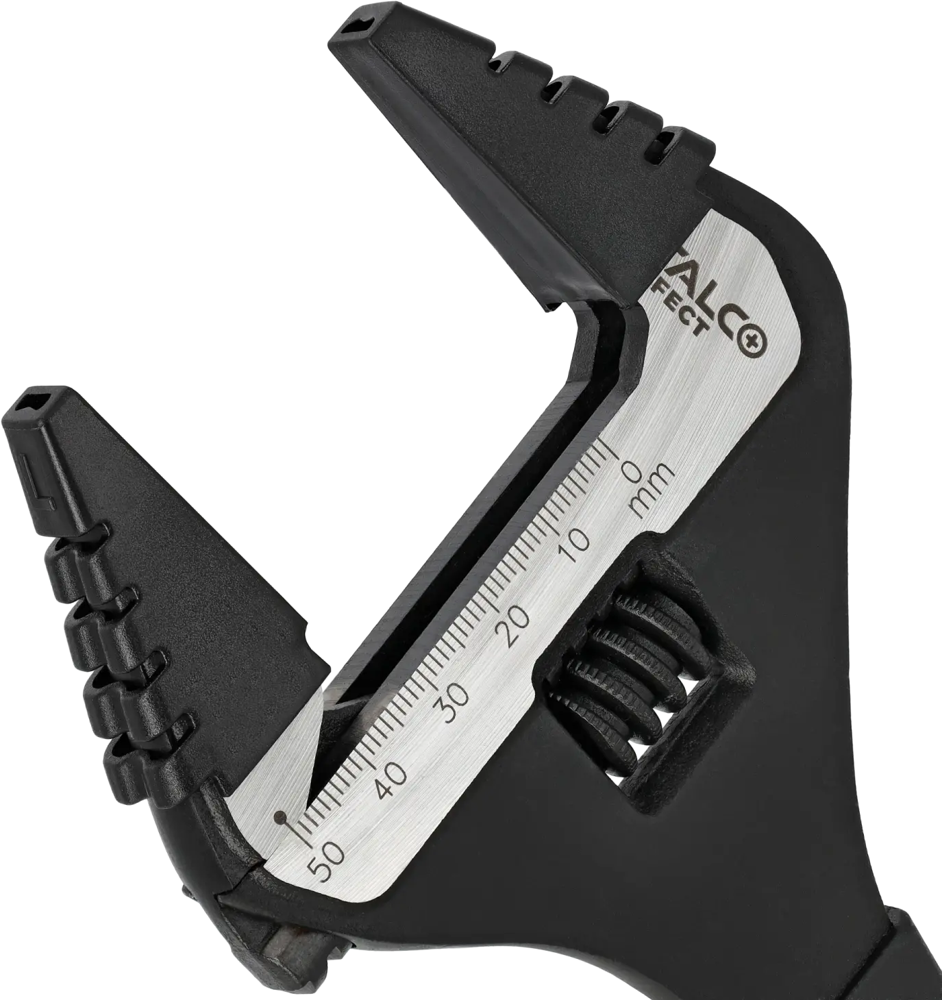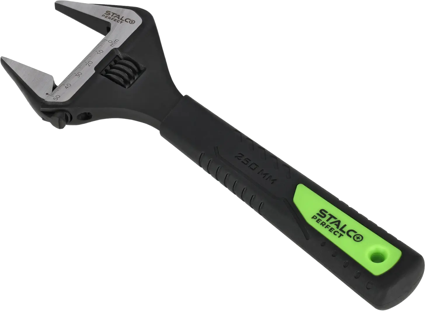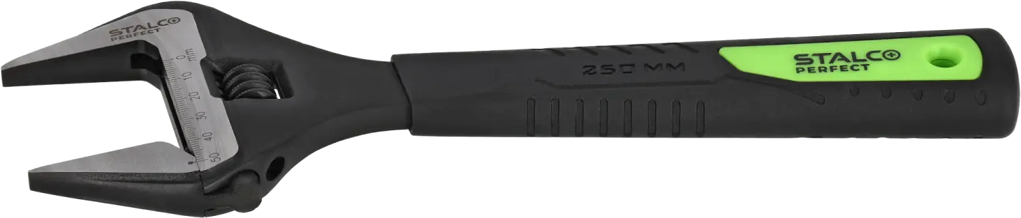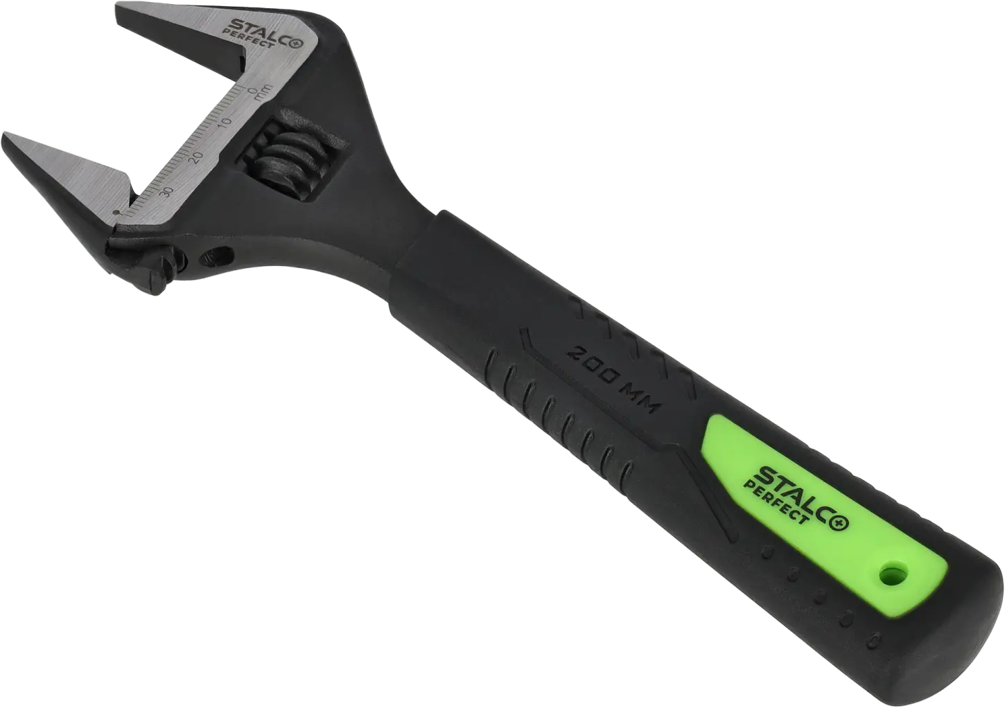 An adjustable wrench is a highly functional hand tool. It is useful for construction, mechanical, and installation work. It can be used on various types of threaded connections. A distinctive feature is the ability to change the jaw spacing. This allows the tool to be adapted to different nut sizes and also facilitates work on components with worn edges. The 150 mm adjustable wrench from the STALCO PERFECT line is equipped with a worm mechanism for adjusting the spacing. A clear vernier scale allows for quick assessment of the spacing. The ergonomic, plastic-coated handle allows for a secure grip. The entire tool is durable and resistant to harmful external factors. STALCO offers three different variants of this type of adjustable wrench. The products differ in the jaw spacing range and handle length.