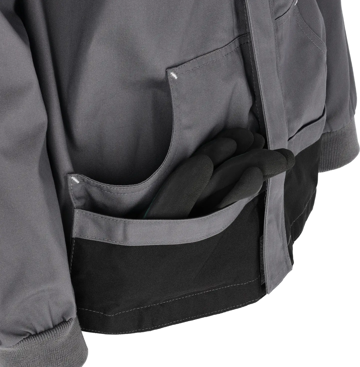 The sweatshirt is equipped with a strong chunky main zipper, ideal for construction and assembly environments. To protect the zipper from dust and reduce airflow, an additional Velcro-secured protective flap is applied. Underarm ventilation openings with zip closures run along the torso and are protected by mesh inserts, allowing controlled airflow while maintaining protection.