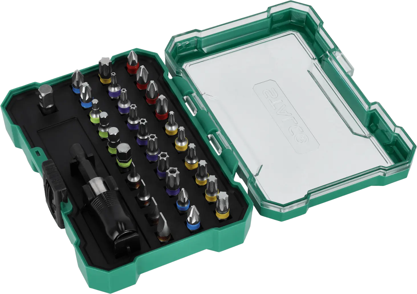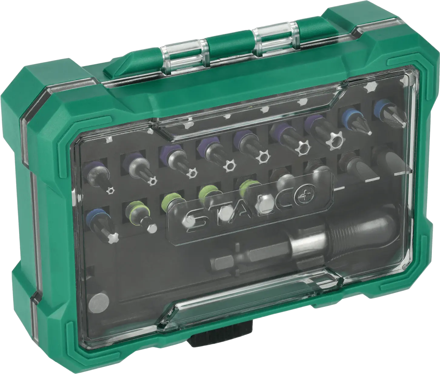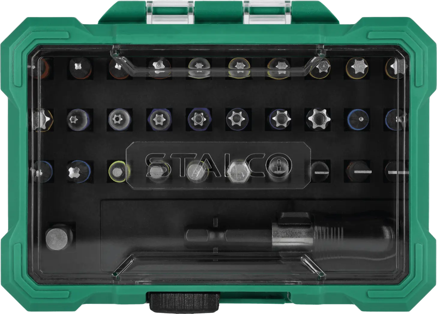 This extensive set of 1/4-inch bits and adapters will find its place in any workshop. It's useful for handling screws with all the most popular socket head types. It contains over 20 different quarter-inch bits. The bits can be used with hand tools and power tools. The set also includes adapters and accessories needed for more difficult tasks. The STALCO set of quarter-inch bits and adapters will be useful for mechanical, construction, and workshop work. It may be necessary for repairs at home and on construction sites. Thanks to the use of S2 steel, the tools are durable and resistant to mechanical damage. They are also protected against moisture. For added protection, all tools are placed in a resealable box, equipped with dedicated individual sockets for each element.
