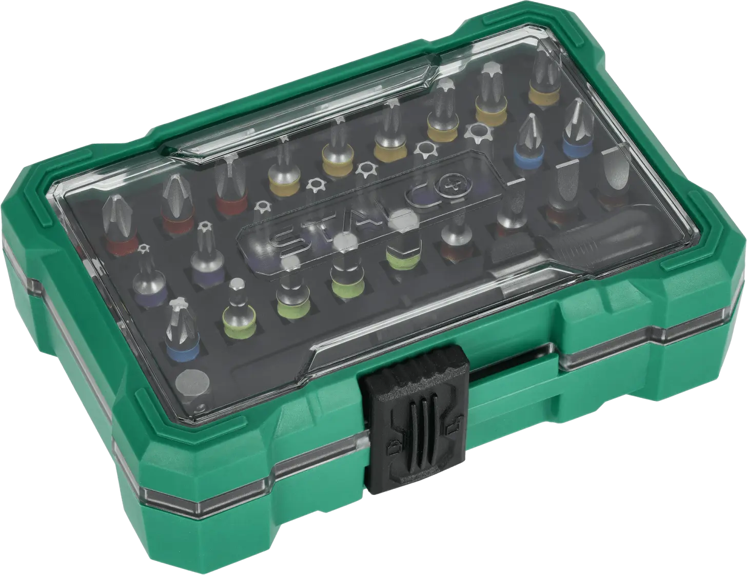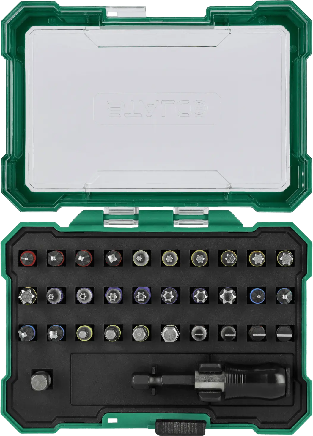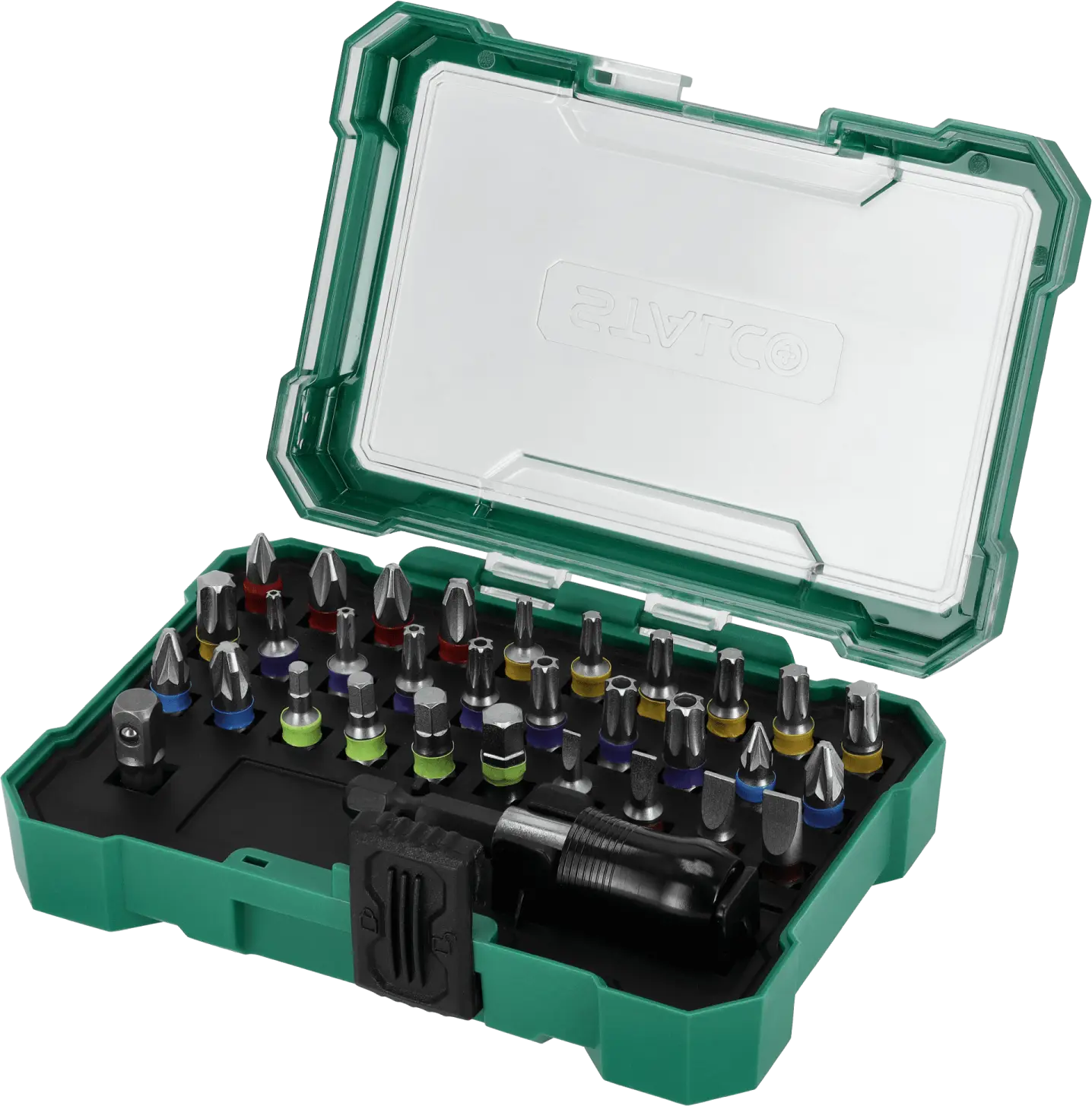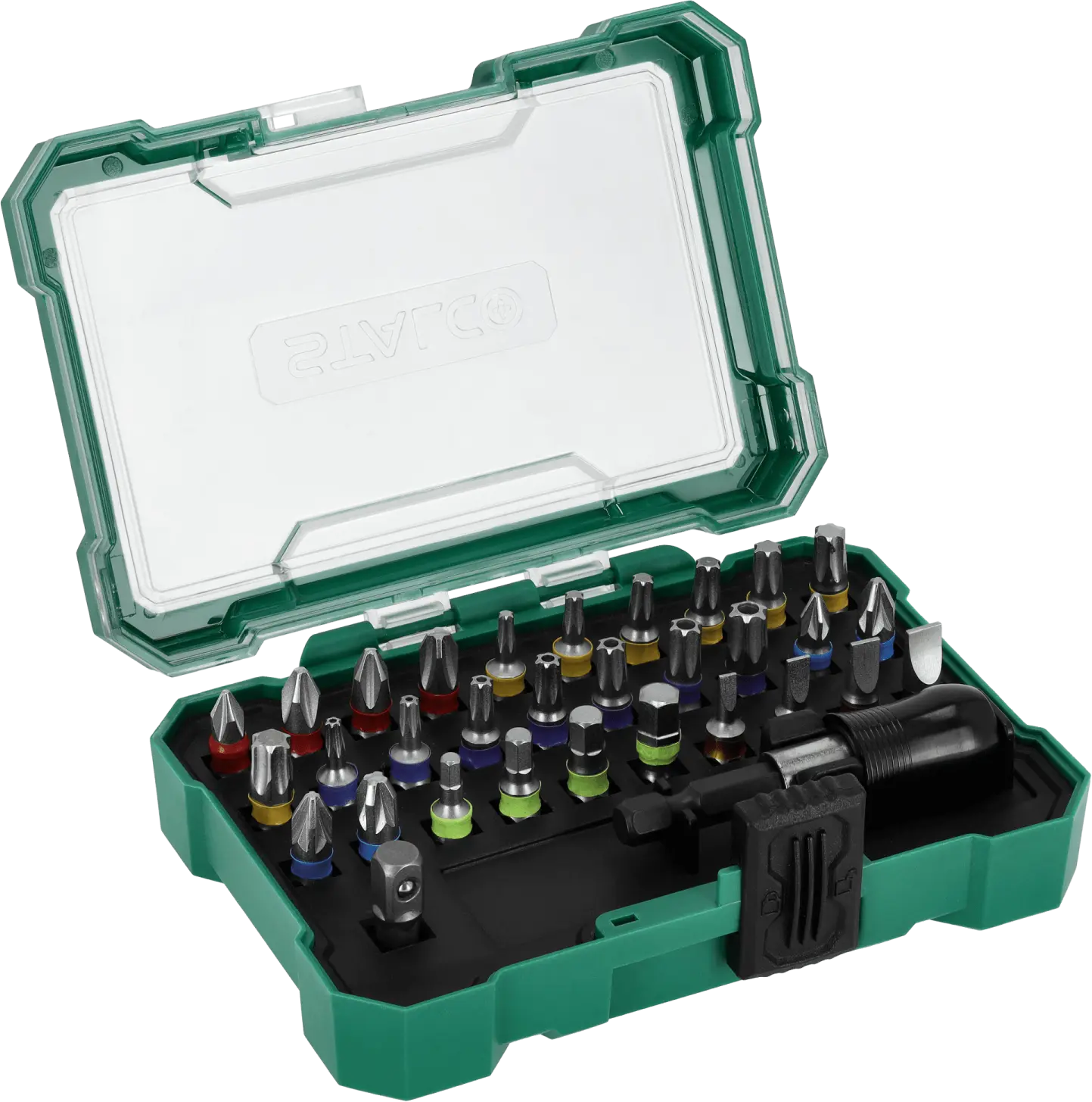 This extensive set of 1/4-inch bits and adapters will find its place in any workshop. It's useful for handling screws with all the most popular socket head types. It contains over 20 different quarter-inch bits. The bits can be used with hand tools and power tools. The set also includes adapters and accessories needed for more difficult tasks. The STALCO set of quarter-inch bits and adapters will be useful for mechanical, construction, and workshop work. It may be necessary for repairs at home and on construction sites. Thanks to the use of S2 steel, the tools are durable and resistant to mechanical damage. They are also protected against moisture. For added protection, all tools are placed in a resealable box, equipped with dedicated individual sockets for each element.