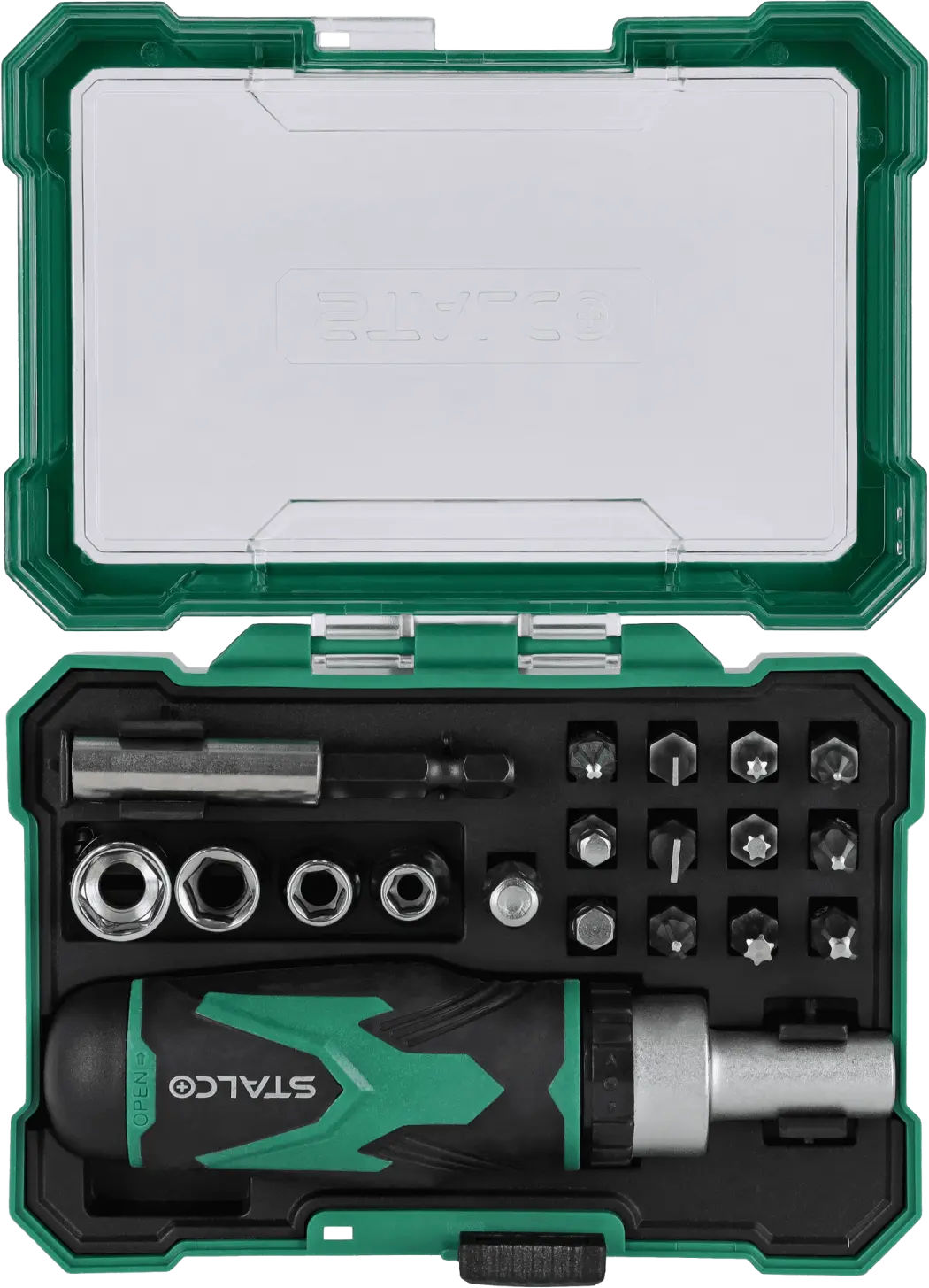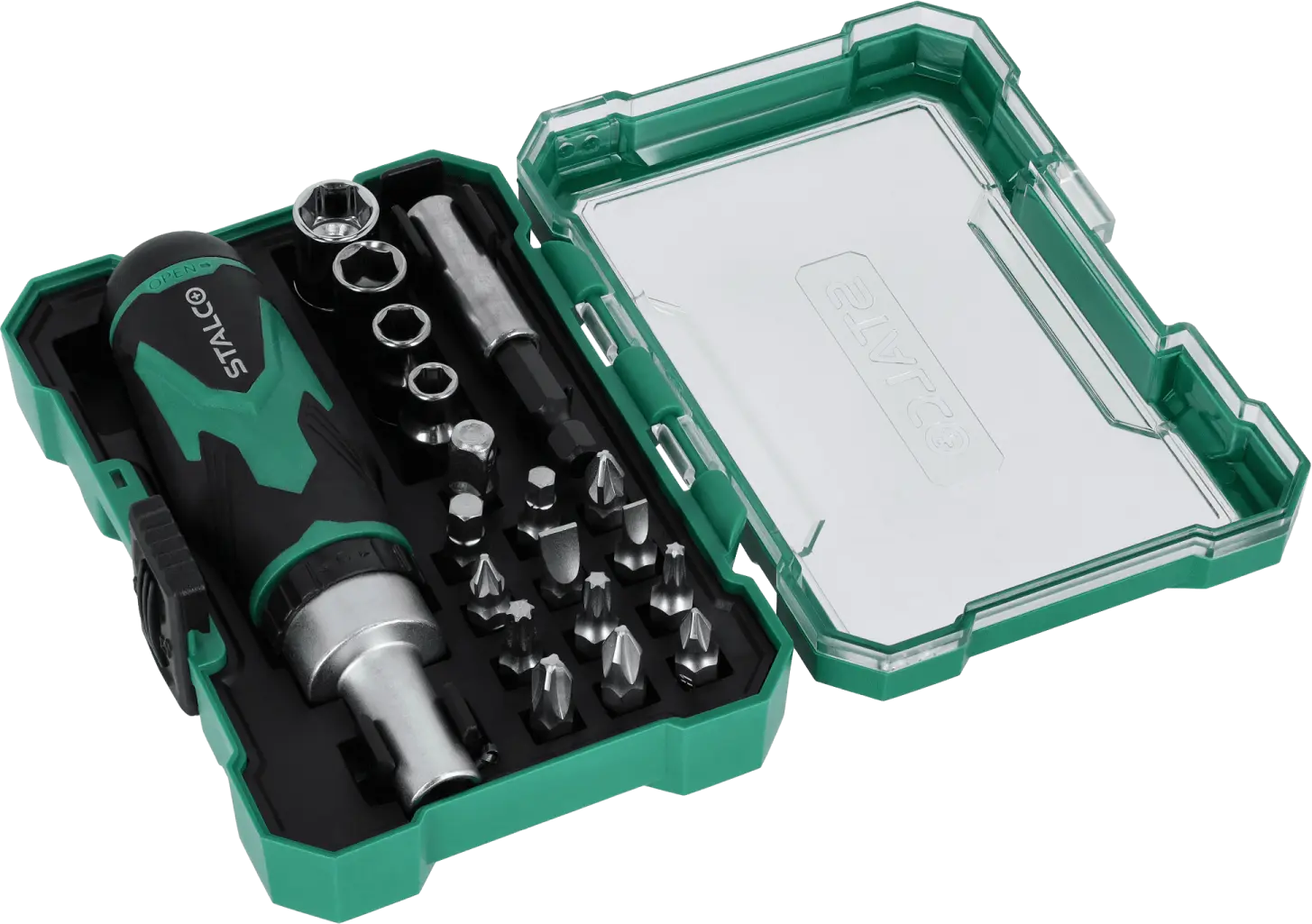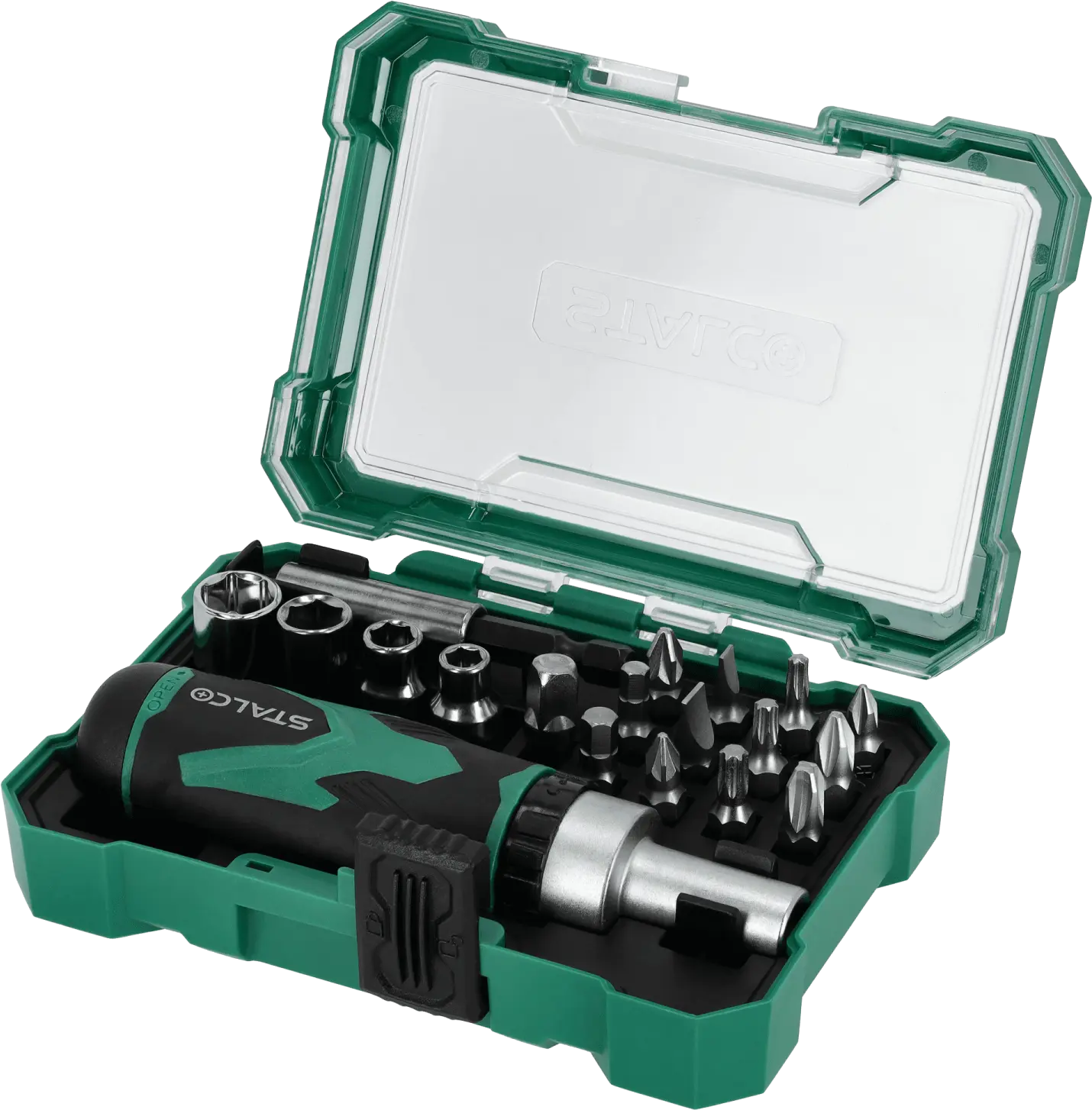 This functional set of 1/4-inch bits, sockets, and accessories will come in handy for many assembly tasks. It includes a set of sockets in various sizes that fit a quarter-inch tool shank. A ratcheting handwheel is used to operate the sockets. The set also includes accessories that make assembly easier. The STALCO set of bits, sockets, and accessories can be used for DIY, construction, and mechanical repairs. It is ideal for work in the workshop and on the construction site. The set is made of S2 steel, providing high resistance to mechanical damage and abrasion, ensuring the accessories will last for a long time. All components are housed in a plastic case that protects them from loss. The packaging also facilitates transport and use of the tools outside the workshop.