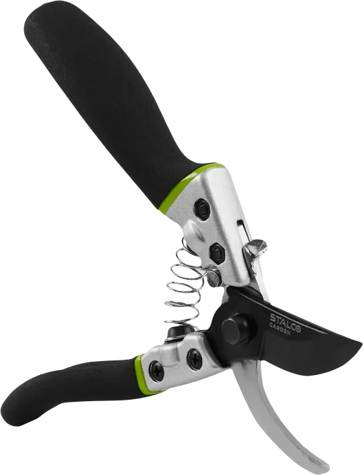 Pruners, shears, and saws are used for maintenance pruning and care of plants.