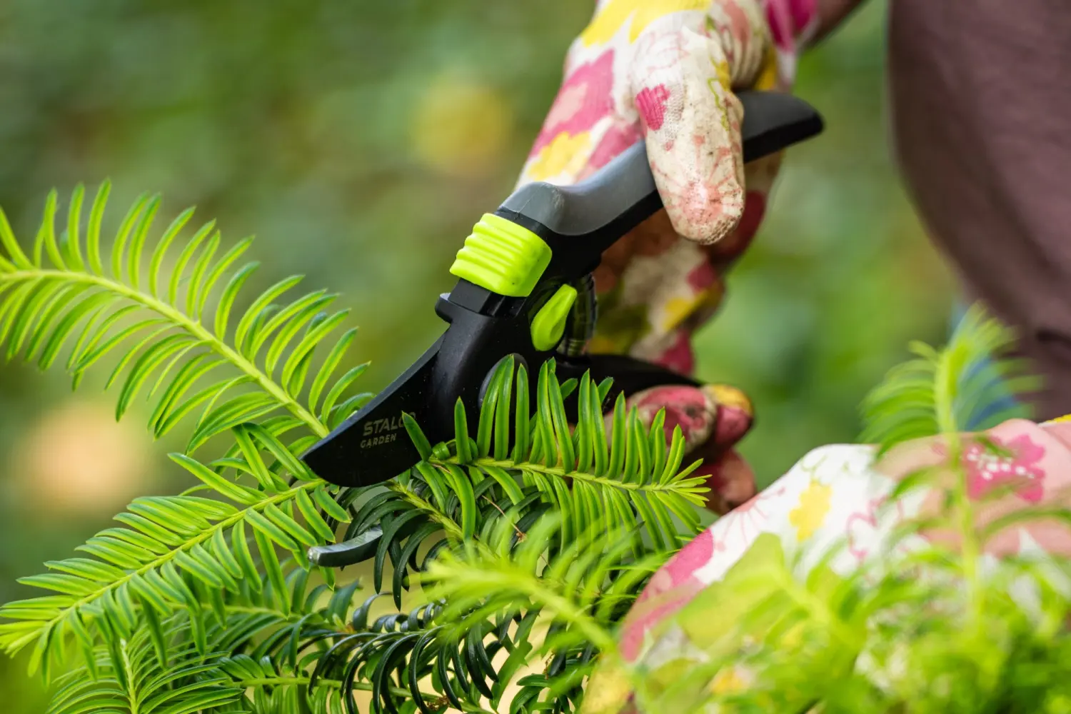 Pruners, shears, and saws are used for maintenance pruning and care of plants.