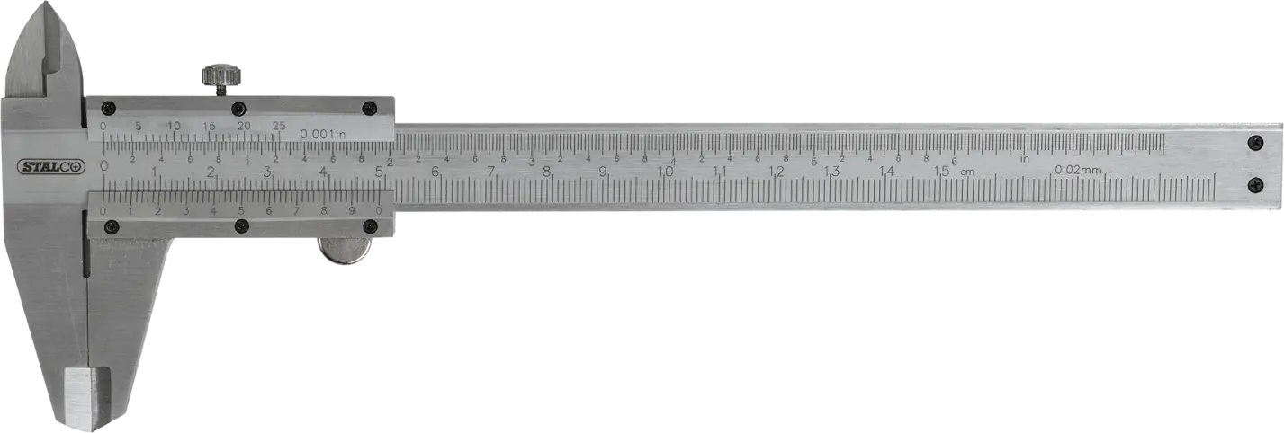 A universal caliper is one of the basic measuring tools. It is used for accurate and precise measurements of width, length, and depth. It is also useful for internal measurements. It proves indispensable for monitoring precise workshop and carpentry work, as well as for production control in industrial plants. The STALCO caliper is a tool made of high-quality stainless steel. It is equipped with a clamping screw to hold the selected jaw spacing. Clear graduations in millimeters and inches allow for measurements with an accuracy of two hundredths of a millimeter.