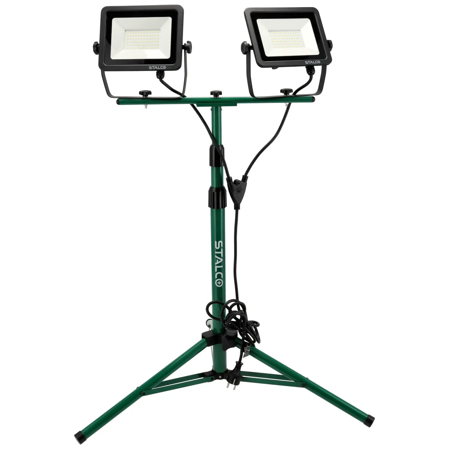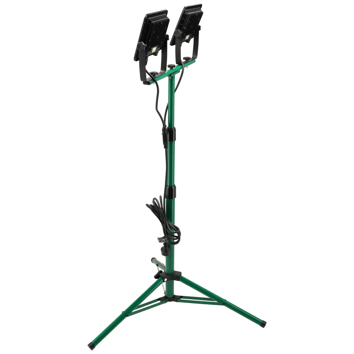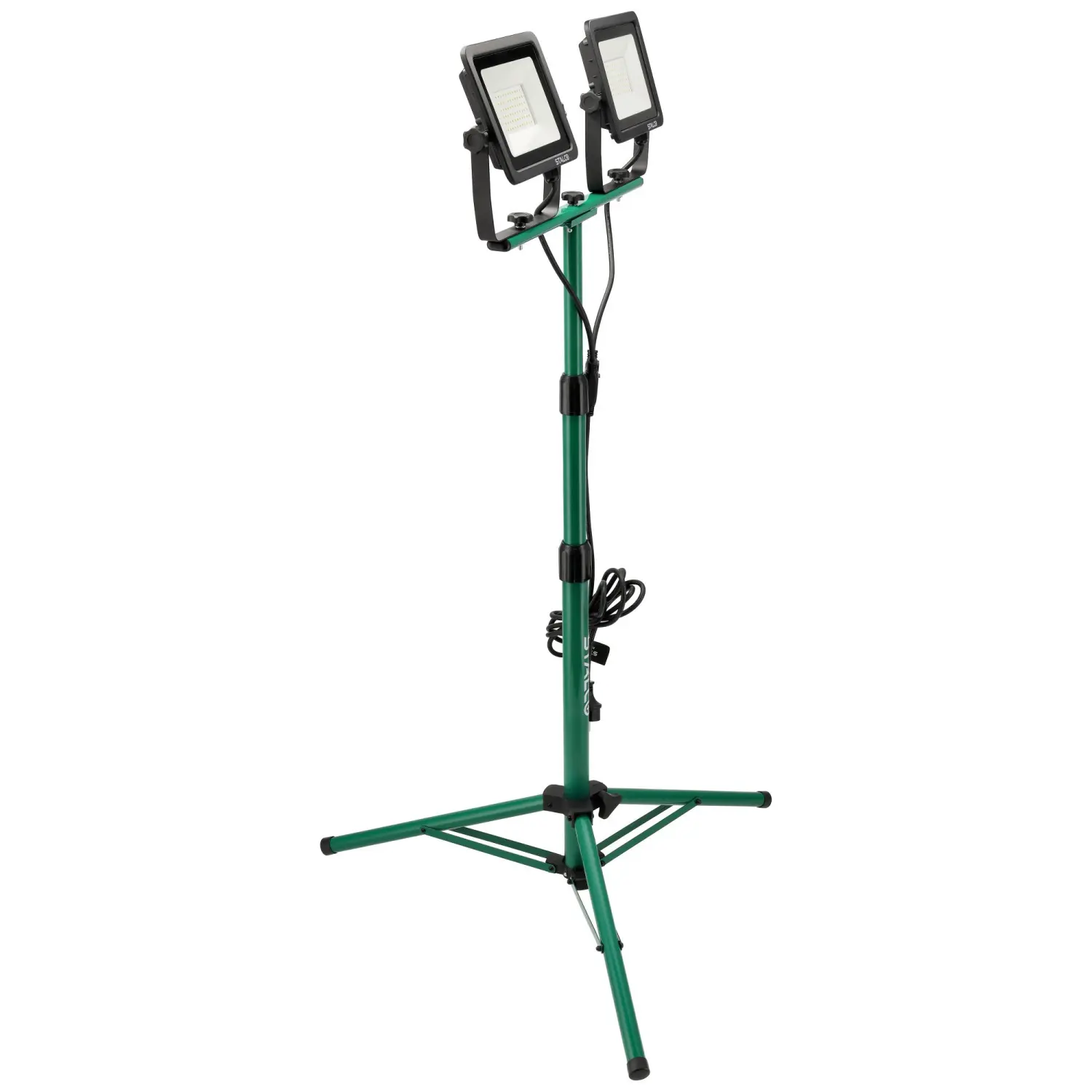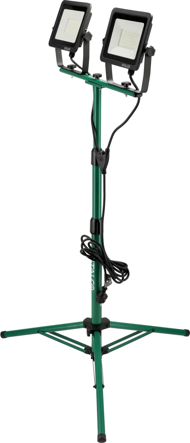 The 2×50W FLS-100W construction floodlight is a reliable electric lighting accessory. It features two 50W LEDs, emitting a combined luminous flux of 9000 lm with neutral white light. The floodlights are mounted on an adjustable, rotatable tripod, allowing precise positioning and beam direction.