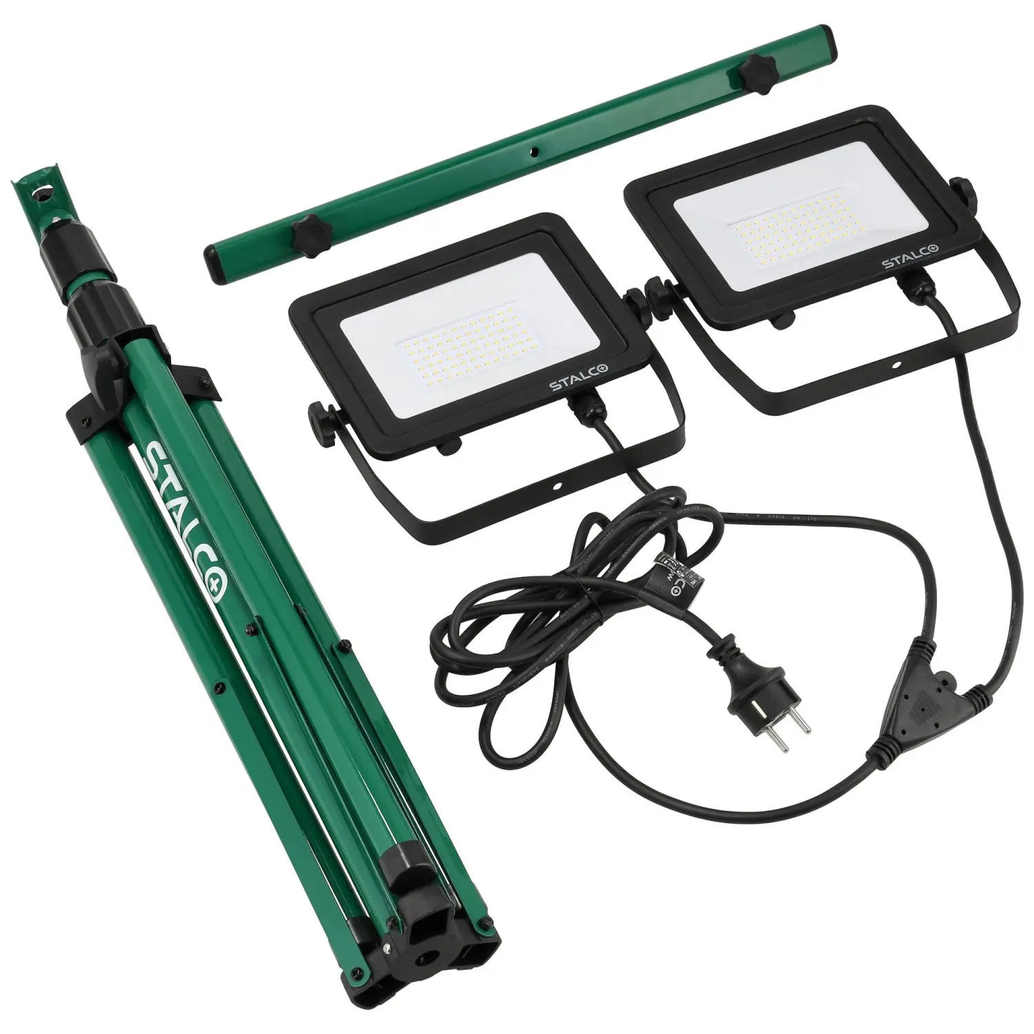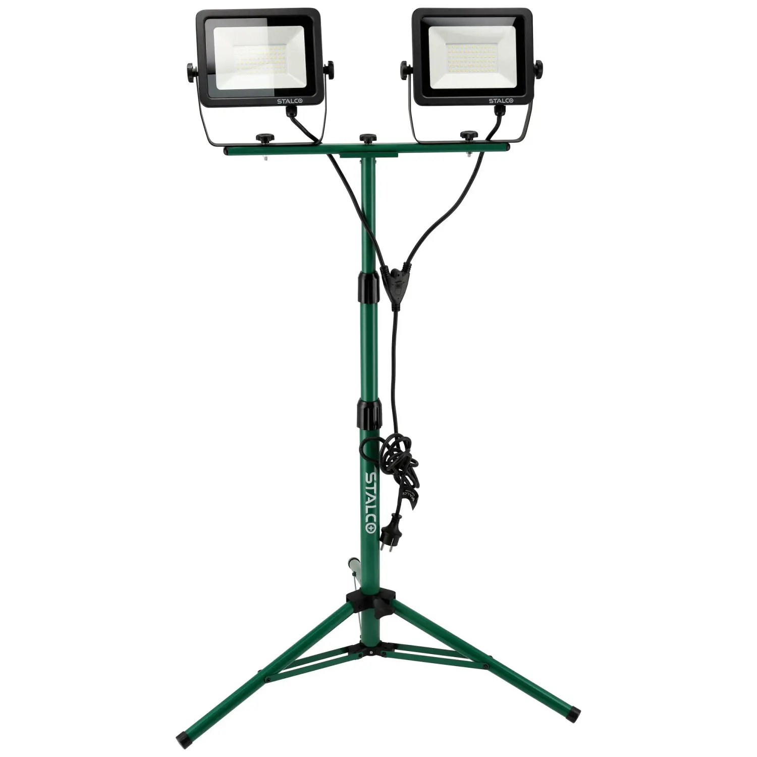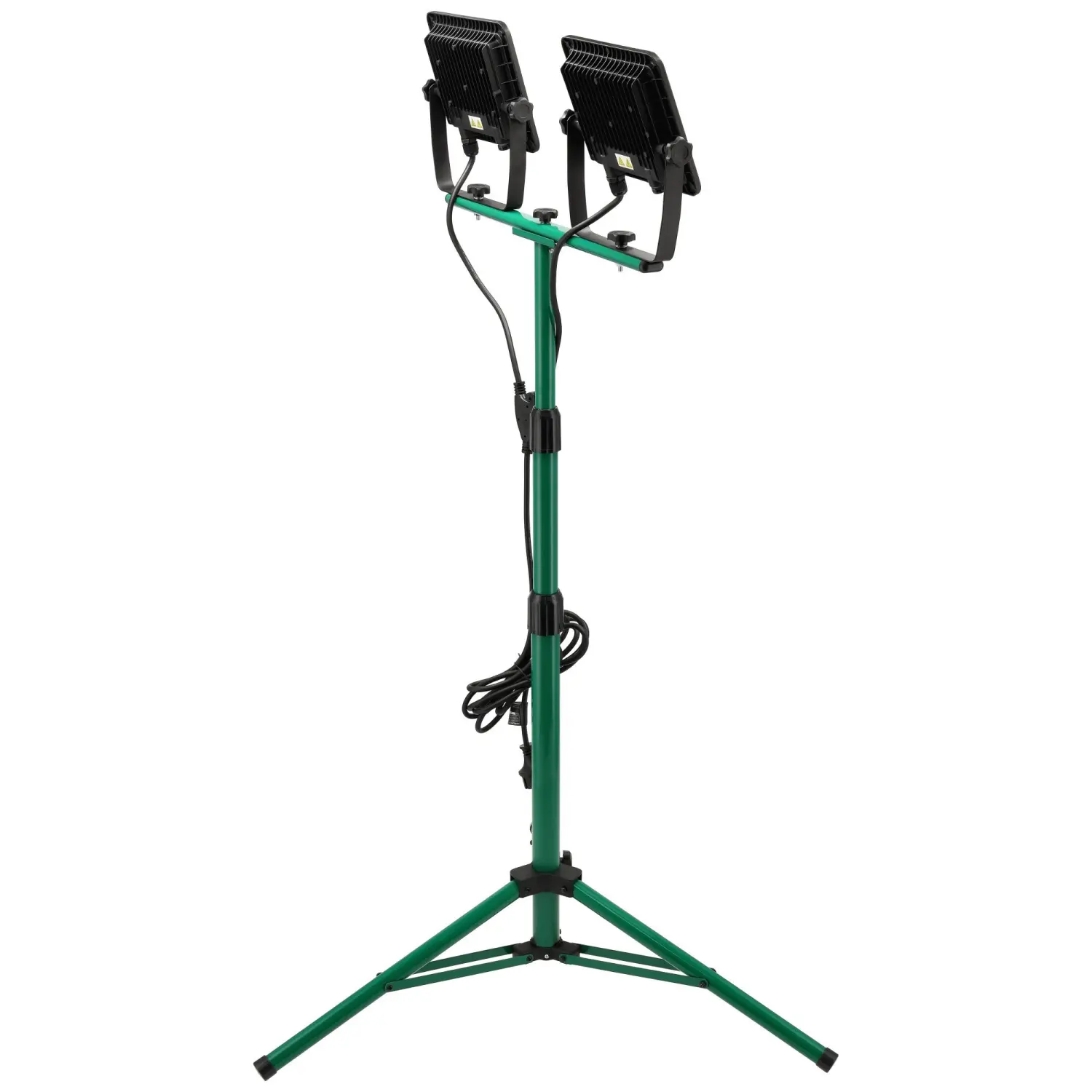 The 2×50W FLS-100W construction floodlight is a reliable electric lighting accessory. It features two 50W LEDs, emitting a combined luminous flux of 9000 lm with neutral white light. The floodlights are mounted on an adjustable, rotatable tripod, allowing precise positioning and beam direction.