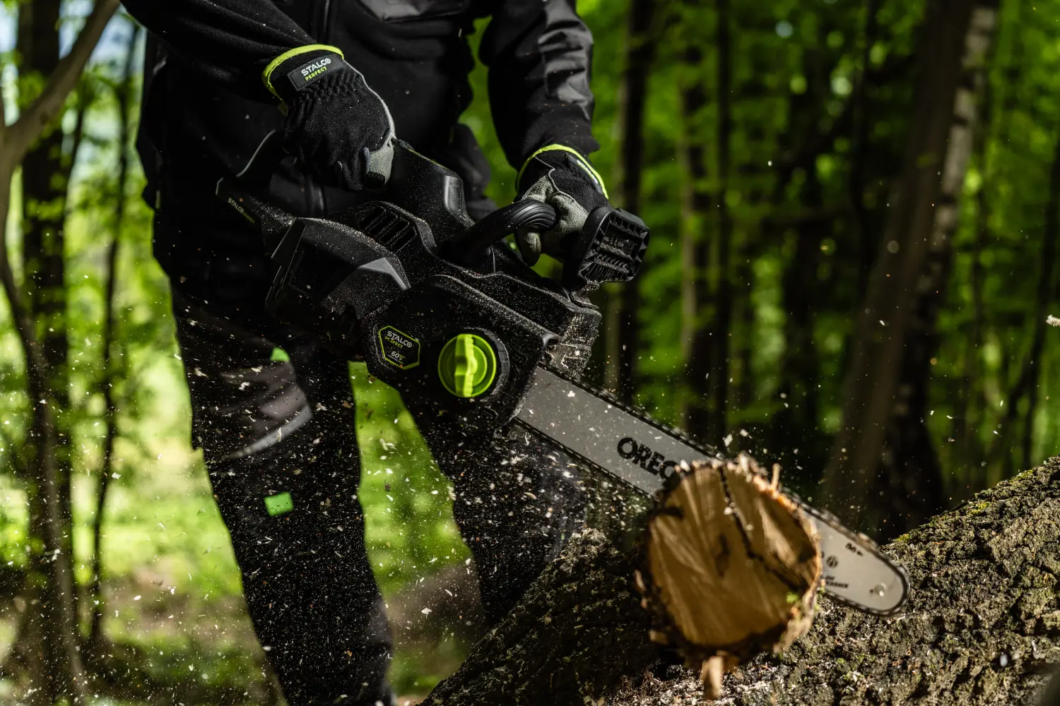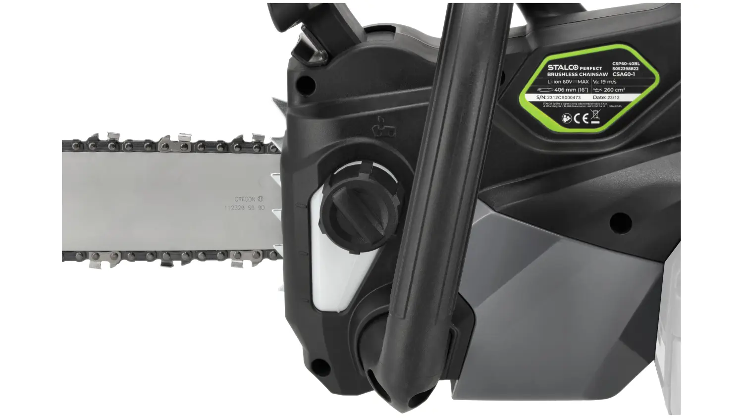 With a chain speed of 19 m/s, it provides efficient and precise wood cutting. The OREGON 406 mm guide bar and chain allow for cutting larger pieces of wood. Tool-free chain tensioning simplifies operation and speeds up work. The automatic oiler with a 260 ml reservoir ensures long-lasting lubrication, enhancing durability and performance.