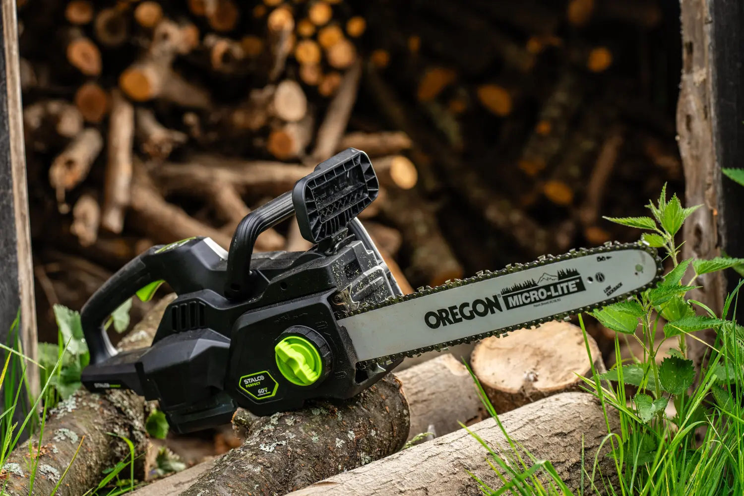 For safety, it features an electronic chain brake that stops the chain quickly in emergency situations, combined with a mechanical brake for immediate manual control. Lightweight at just 4 kg, it is easy to handle and transport.