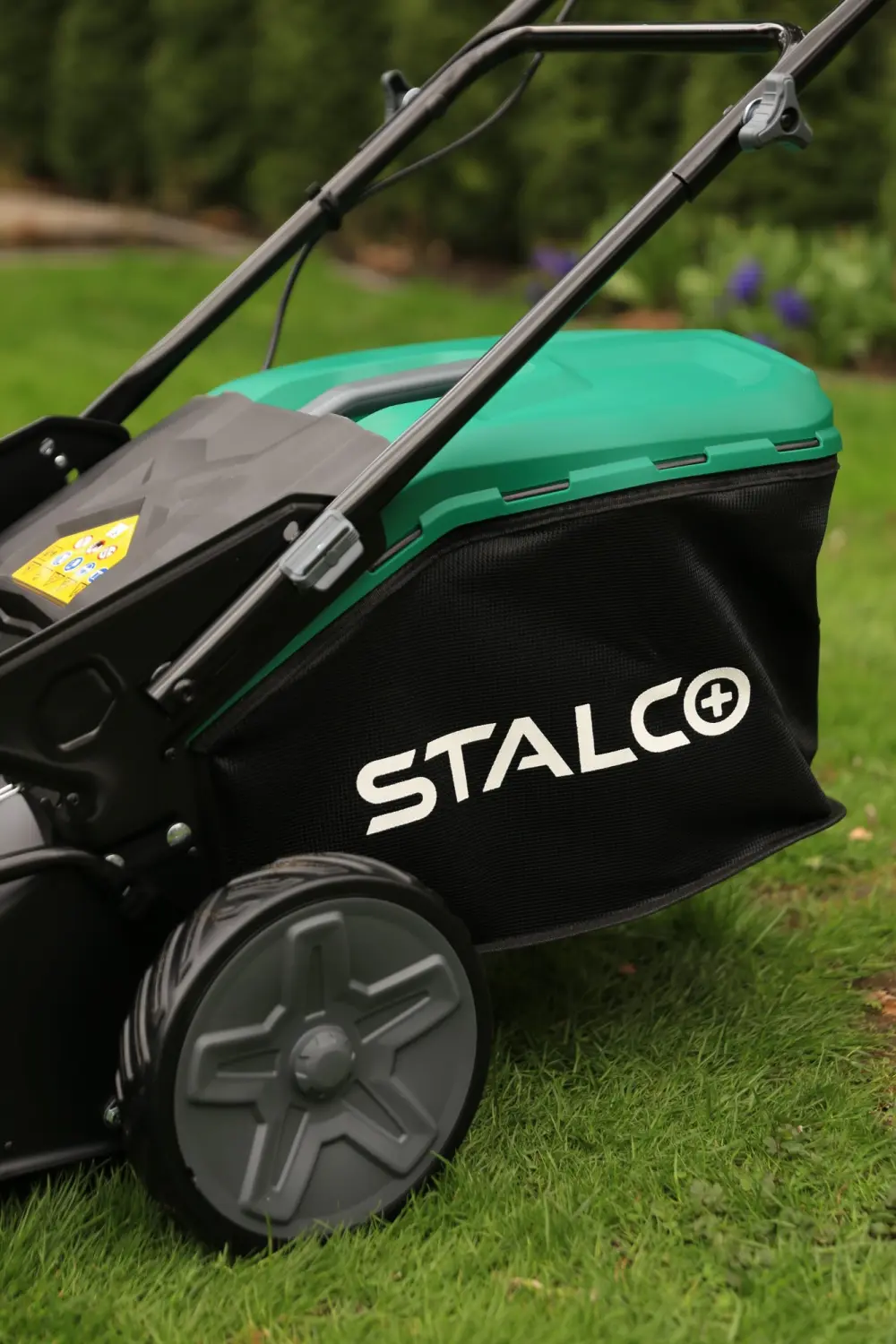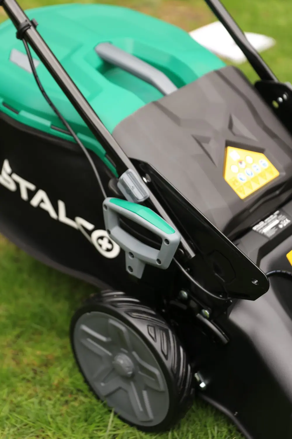 With a 46 cm cutting width, it quickly handles large, even lawns. The 6-level cutting height adjustment allows precise control of grass length. Turbo mode can be used for faster cutting under heavy load or dense grass. Grass is collected in the included 55-liter box, and depending on the setting, clippings can be mulched, collected, or expelled from the side or rear.