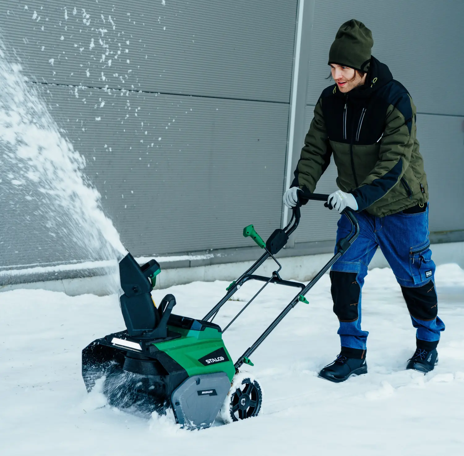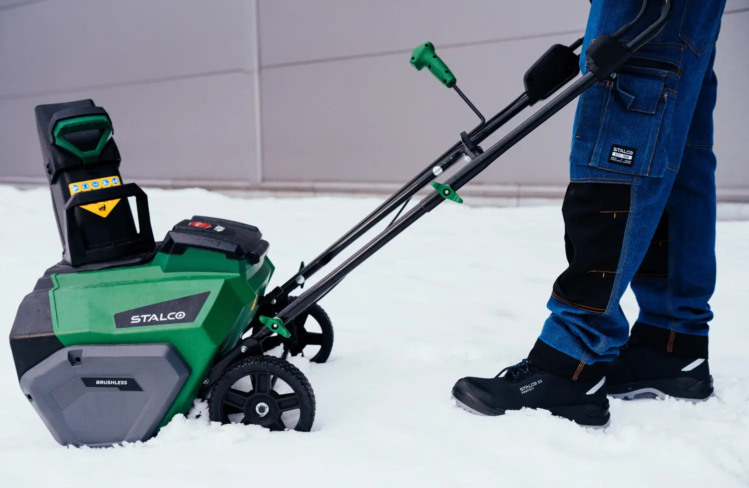 The STALCO cordless snow blower delivers highly efficient performance thanks to its powerful brushless motor. It features a 508 mm wide intake and a height of 254 mm. The auger with a diameter of 172 mm can throw snow up to 8 meters, ensuring efficient snow removal and easy snow management. Integrated LED lighting improves visibility when working after dark.