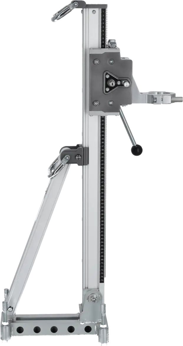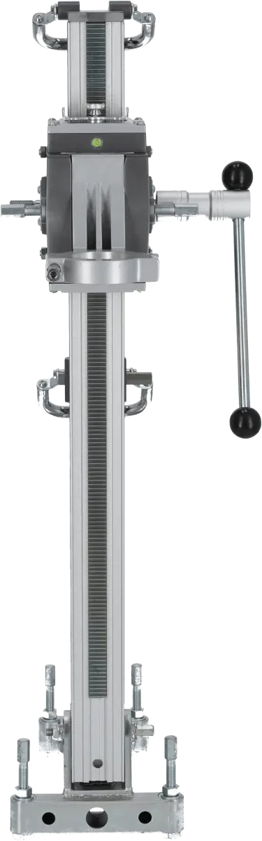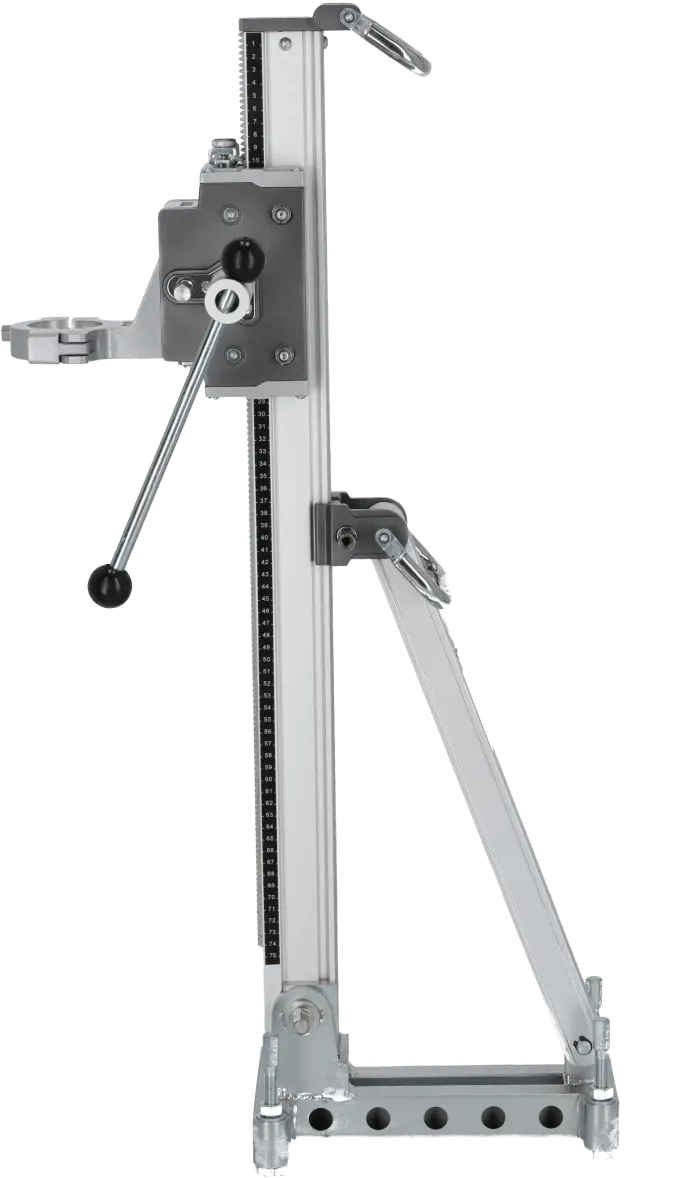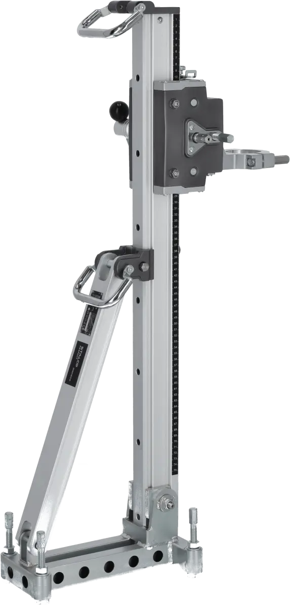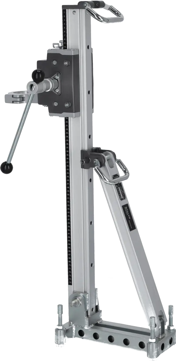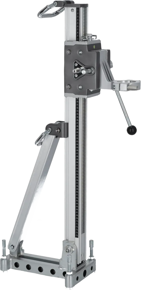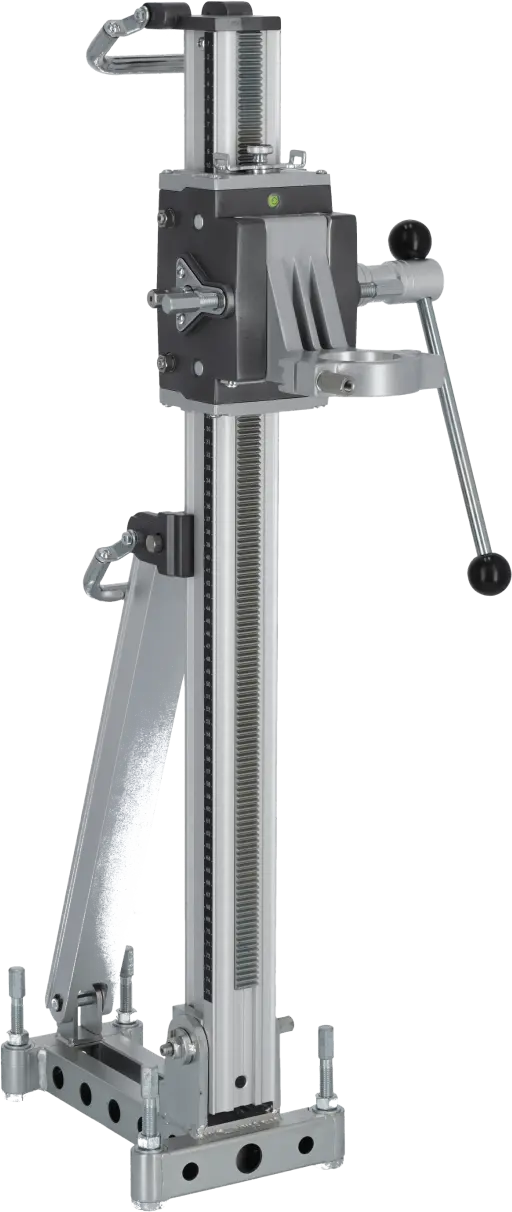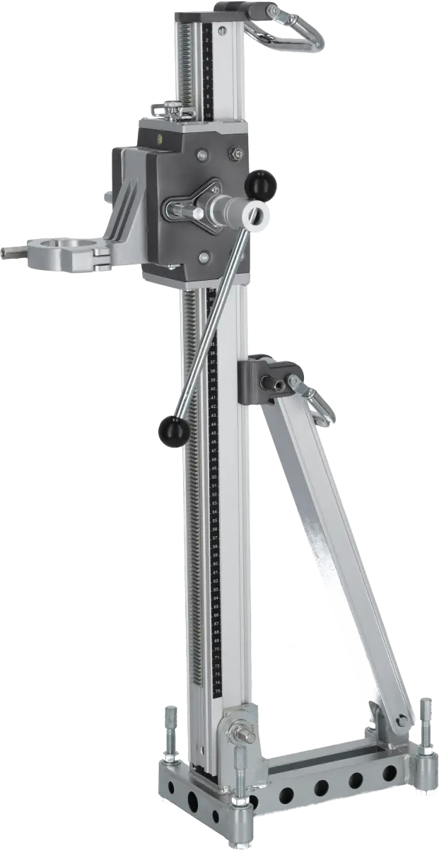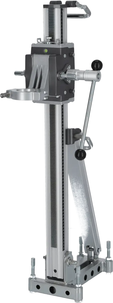 The DRP202 Diamond Drill Stand is an auxiliary tool designed for positioning diamond drills during drilling operations. Its professional construction supports large drills with core bits up to 202 mm in diameter. The stand maintains stability even during heavy-duty construction work. It allows angle adjustment of the drill and enables drilling to a depth of 510 mm. The 60 mm clamping support ensures a secure and durable connection, even under significant vibrations, allowing safe and precise drilling.
