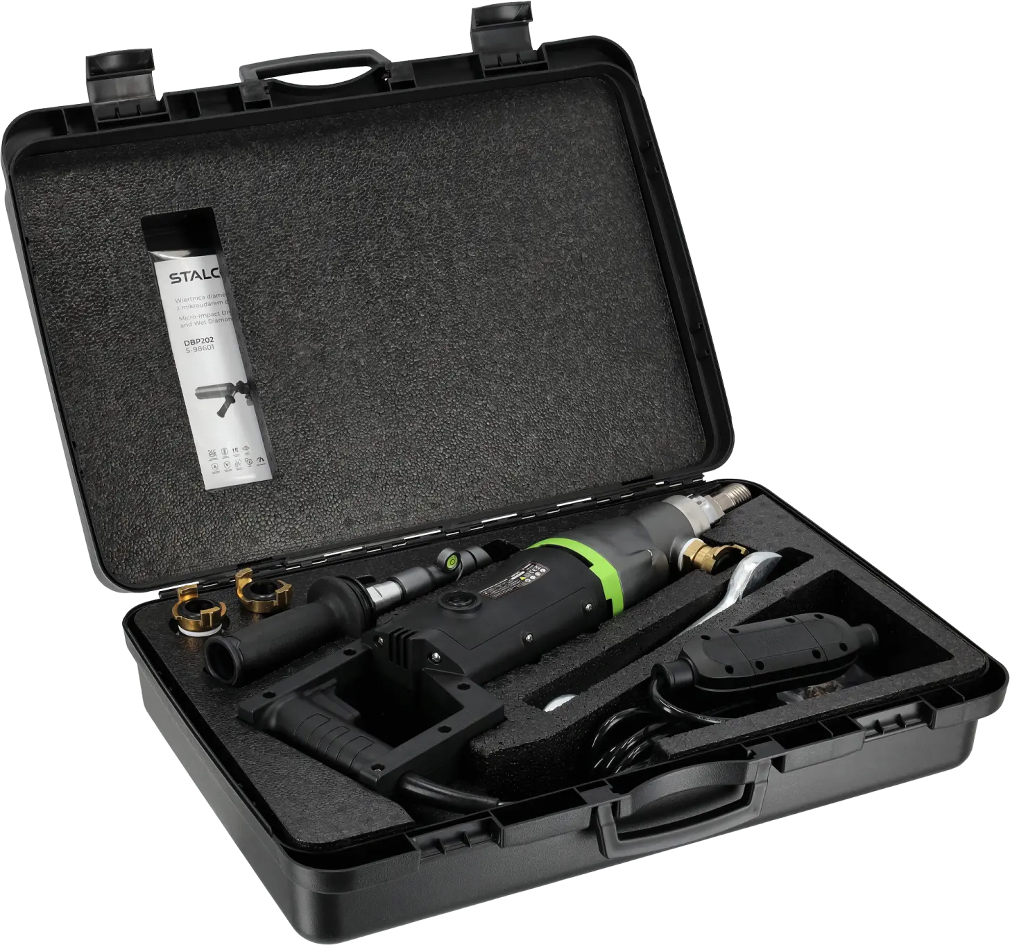 Front auxiliary handle, quick water connection, quick vacuum connection, 37 mm & 42 mm wrenches, replaceable carbon brushes, instruction manual