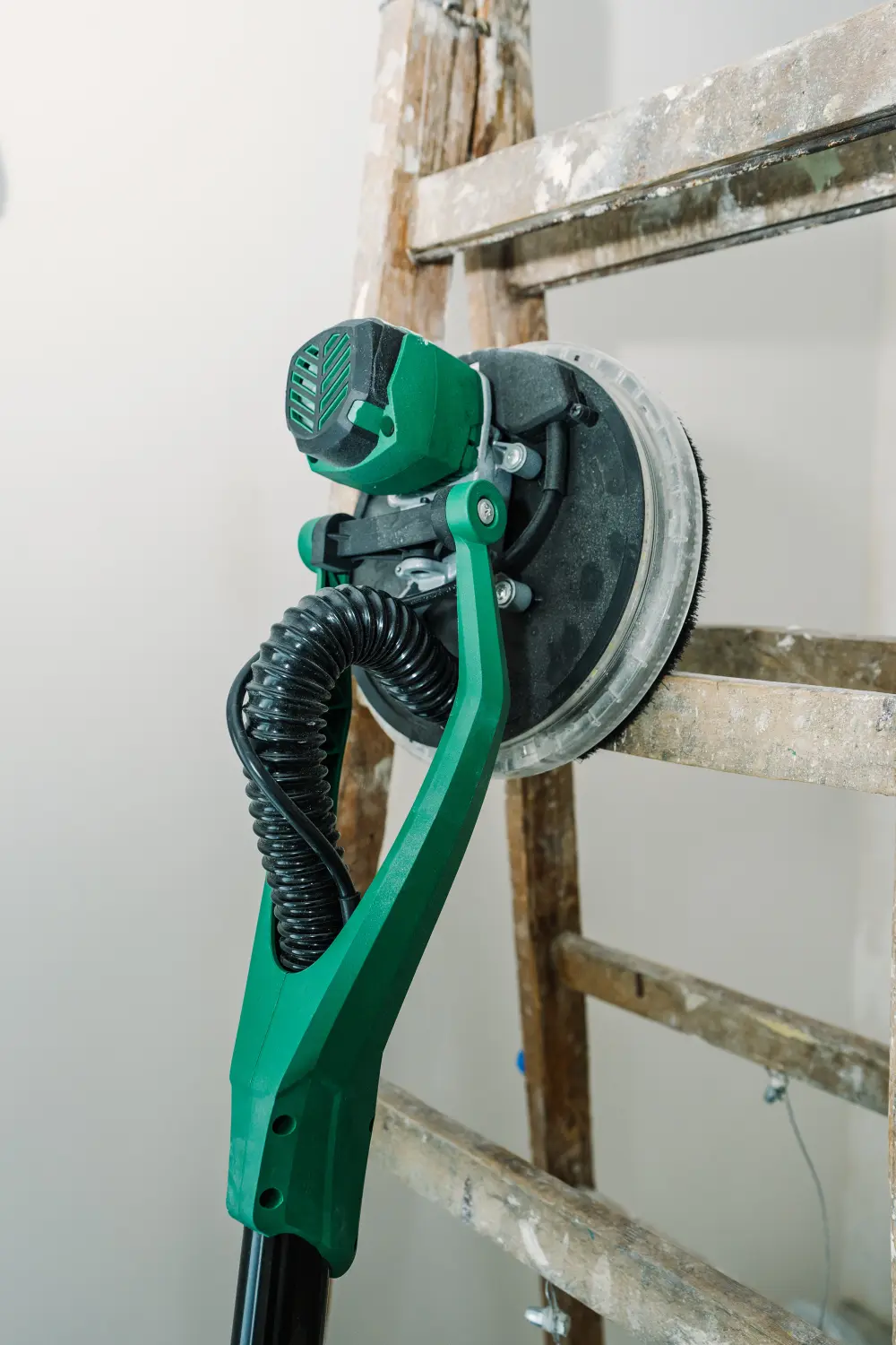 The DWS225BL STALCO drywall sander is equipped with a 500 W brushless motor. The motor drives the sanding disc at speeds ranging from 900 to 2100 rpm, while step-based speed adjustment makes it easy to match the speed to the specific task. The motor is positioned in the head, ensuring good balance and high working comfort. The sander is mounted on an extension arm, allowing work on most vertical and horizontal surfaces. The sanding head is also equipped with LED lighting, and the dust extraction outlet enables connection to a vacuum cleaner, ensuring a clean working environment.