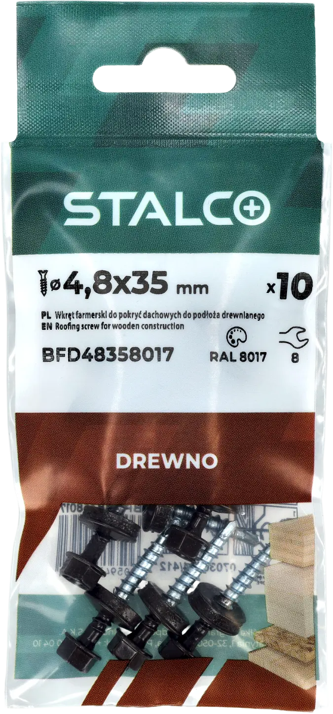 Screws with a diameter of 4.8 mm are available in various lengths. The option of painting the head in any RAL color allows matching it to roofing and finishing sheets, ensuring an aesthetic, consistent finish and additional corrosion protection.