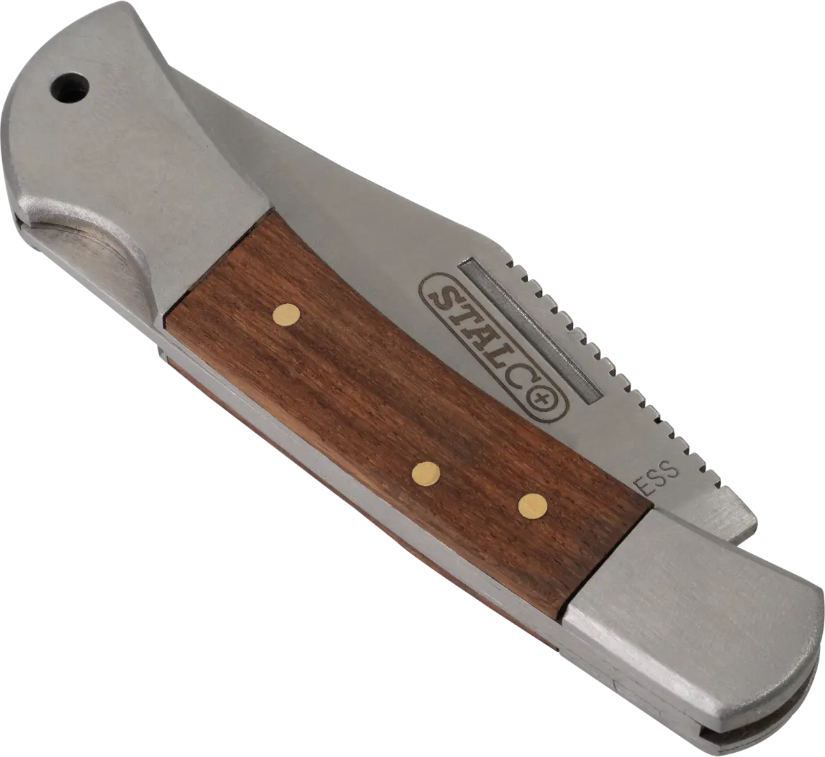 The STALCO folding assembly knife is a highly versatile tool. Its steel construction consists of a blade and a handle covered with a wood-based material. The blade has a cutting and sawing surface, allowing for a variety of tasks. It's made of stainless steel, ensuring durability and a long service life. You can carry this functional assembly knife with you in a portable case that can be attached to your belt. This allows you to use the blade for various tasks, especially those carried out outdoors.