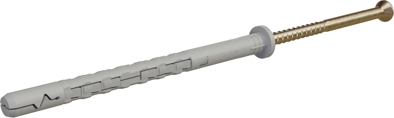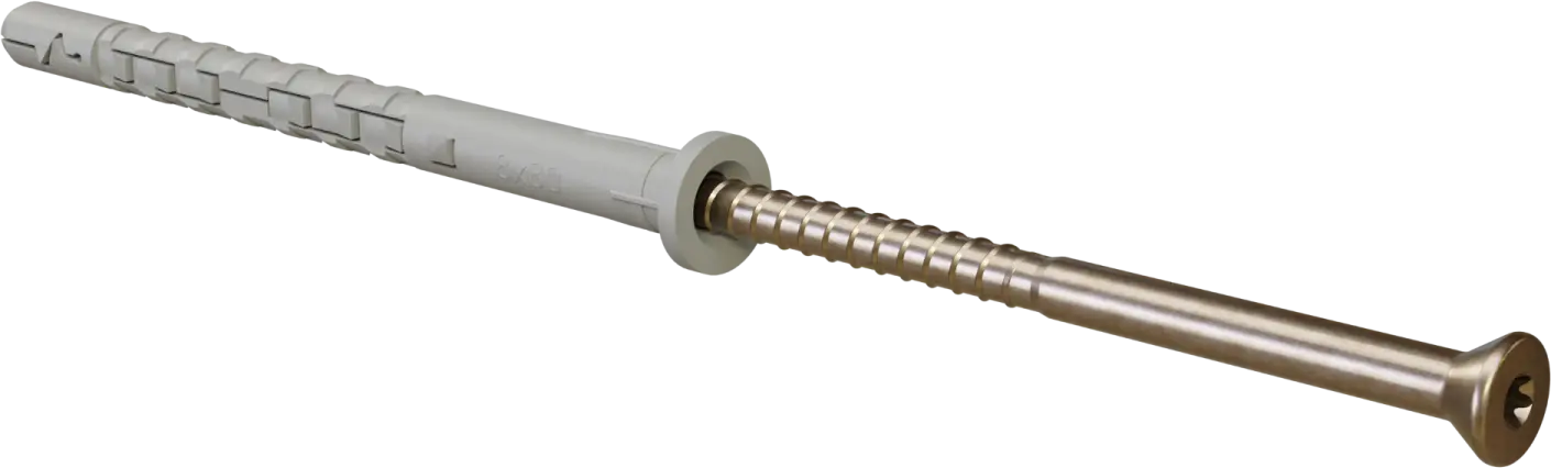 The TXS frame expansion plug is a connector designed for mounting in all types of building substrates – solid and perforated. It consists of a polyamide sleeve and a zinc-plated steel screw. The screw has a countersunk head with a TORX socket that is flush with the fastener.