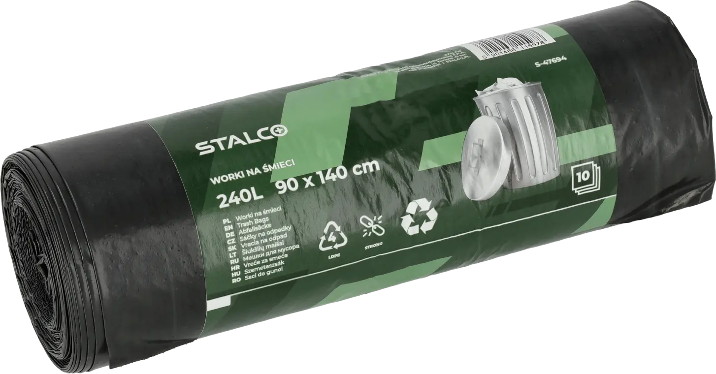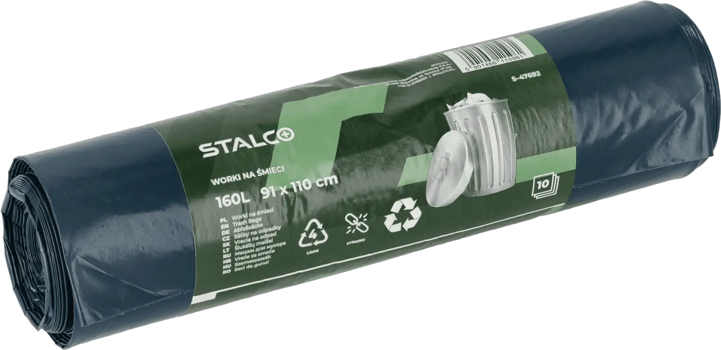 Garbage bags are essential accessories for home, garden, and workplace use. STALCO offers bags made of low-density polyethylene (LDPE). This material is flexible and highly tear-resistant. STALCO garbage bags are strong and roomy. They can be used to collect municipal waste, as well as many construction materials. They are available in 120, 160, and 240 liters. Rolls contain 10 or 20 identical bags.