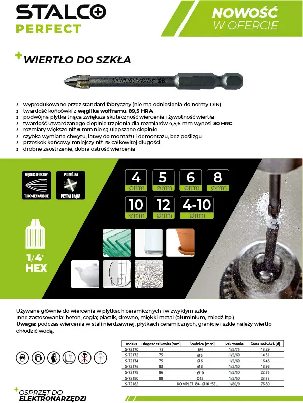 This glass and ceramic drill bit is useful for a variety of finishing projects. It is used for creating countersinks and through holes in any glass, ceramic, and stoneware. The drill bit features a hexagonal shank that can be used in drills and screwdrivers. This ensures easy installation and replacement, and prevents the drill bit from slipping. The shank is heat-hardened, achieving a hardness of 30 HRC. This parameter reduces the risk of breakage and other mechanical damage. The working part is made of double-tipped tungsten carbide with a hardness of 89.5 HRC. This material produces holes quickly and precisely. The STALCO PERFECT range includes drill bits with blade diameters ranging from 4 to 12 millimeters. All are perfectly sharpened, ensuring precision and short drilling times.