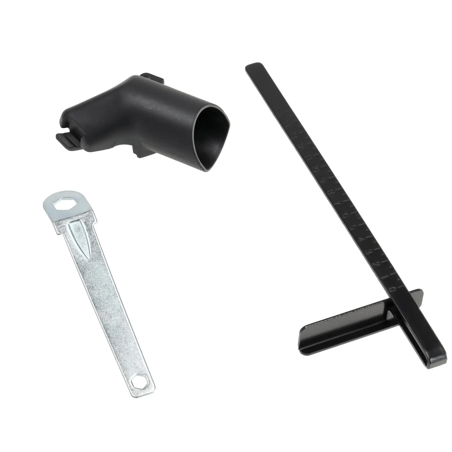 The set includes a parallel guide, vacuum adapter, wrench, and one universal saw blade.