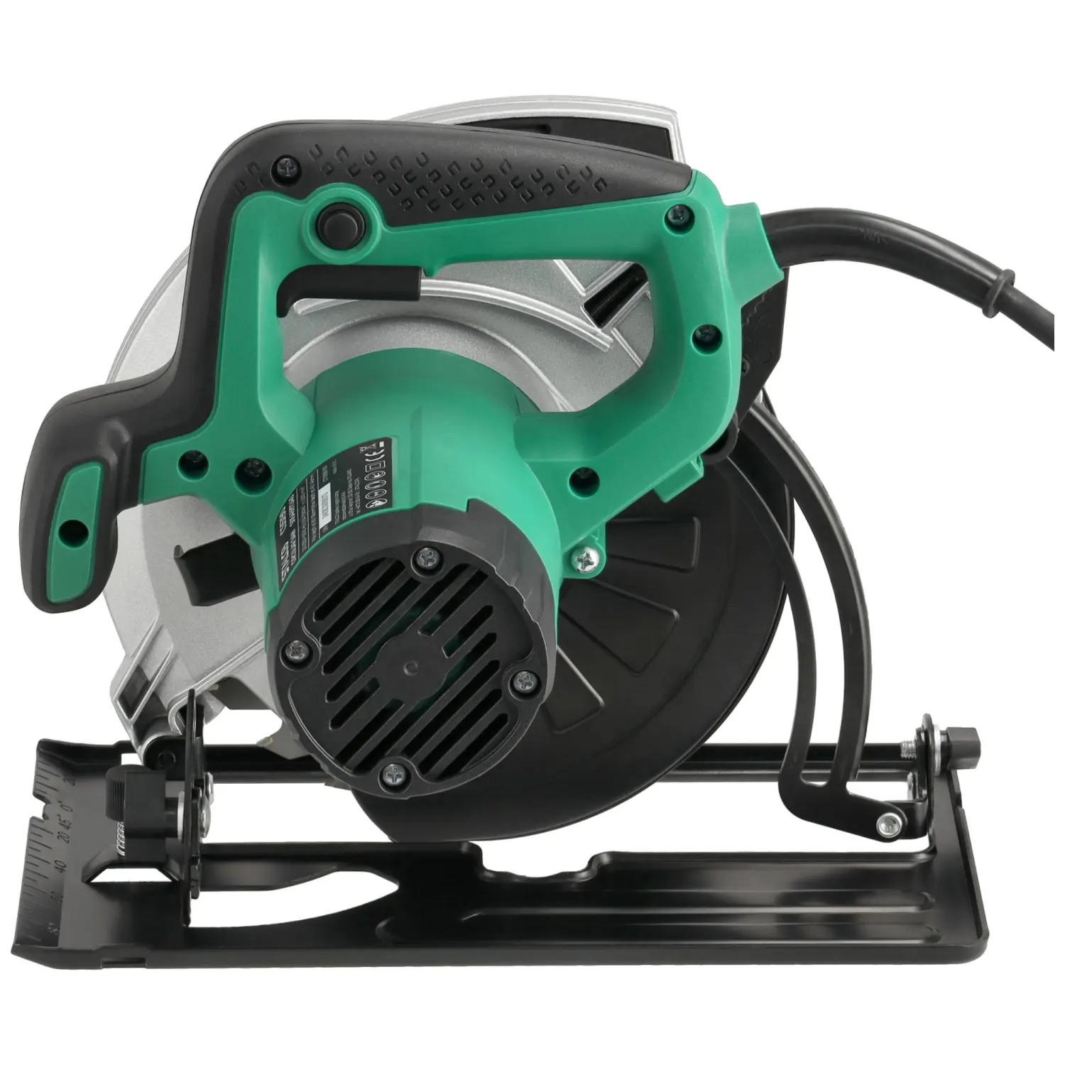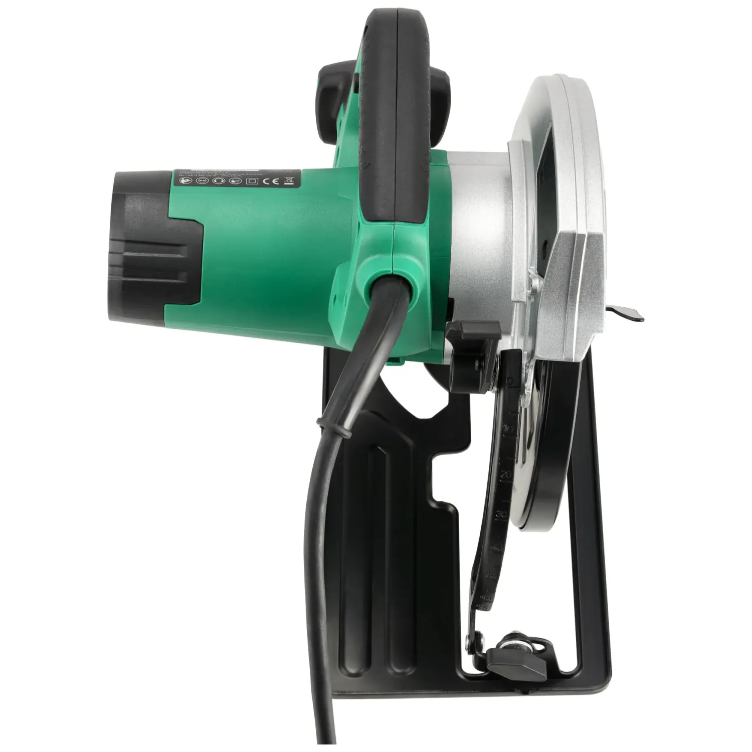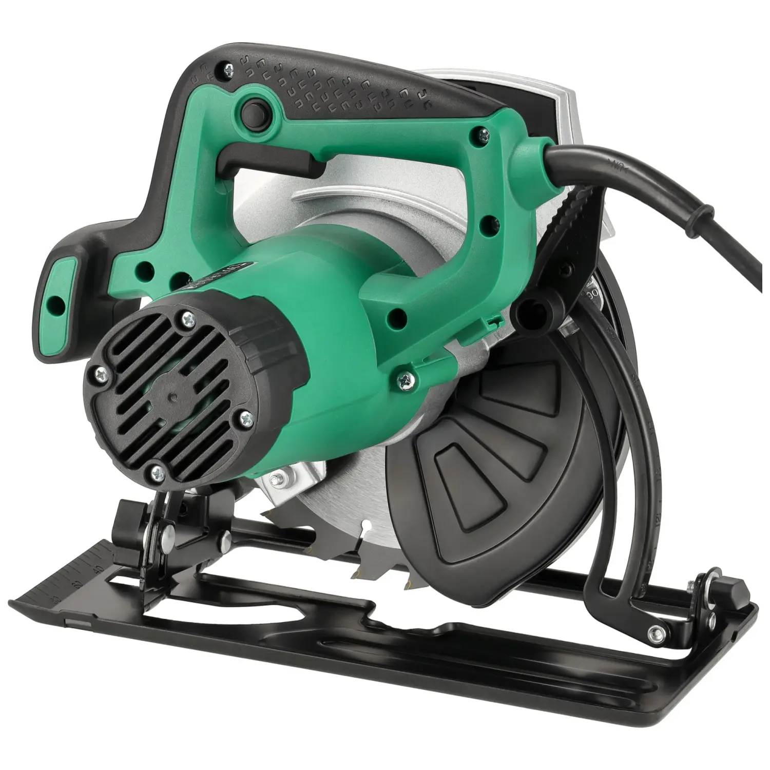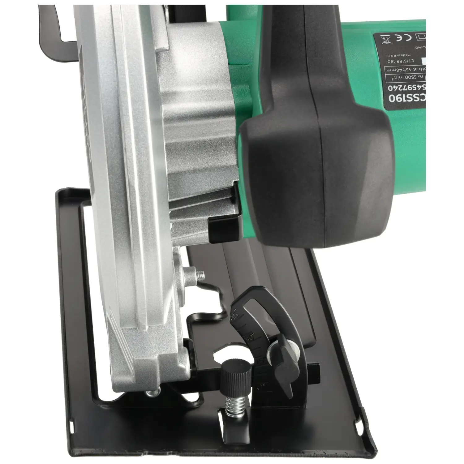The saw supports blades up to 190 mm in diameter and is powered by a 1500 W motor capable of 5500 RPM, making it suitable for demanding tasks. Safety guards and mechanisms enhance user protection during operation. The saw foot can be adjusted from 0° to 45°, and depth adjustment ensures accurate cuts up to 66 mm, including groove cutting.