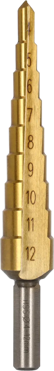 For the most demanding metalworking jobs, an HSS-TiN step drill bit can be indispensable. This power tool accessory is used for enlarging holes, centering drill holes, or milling internal edges. The product can be operated with screwdrivers and drills equipped with cylindrical chuck jaws. The STALCO PERFECT HSS-TiN step drill bit is useful for demanding and professional tasks. It is made of HSS high-speed steel with a titanium nitride coating, providing high abrasion resistance and enabling work with the hardest metals. A spiral flute for chip removal and a cross-cut grind are formed during manufacturing. The drill bit's dimensions are laser-engraved, making it very comfortable to work with. Furthermore, it leaves a smooth edge inside the hole after drilling. STALCO offers three different drill bits, suitable for holes of various diameters and depths.