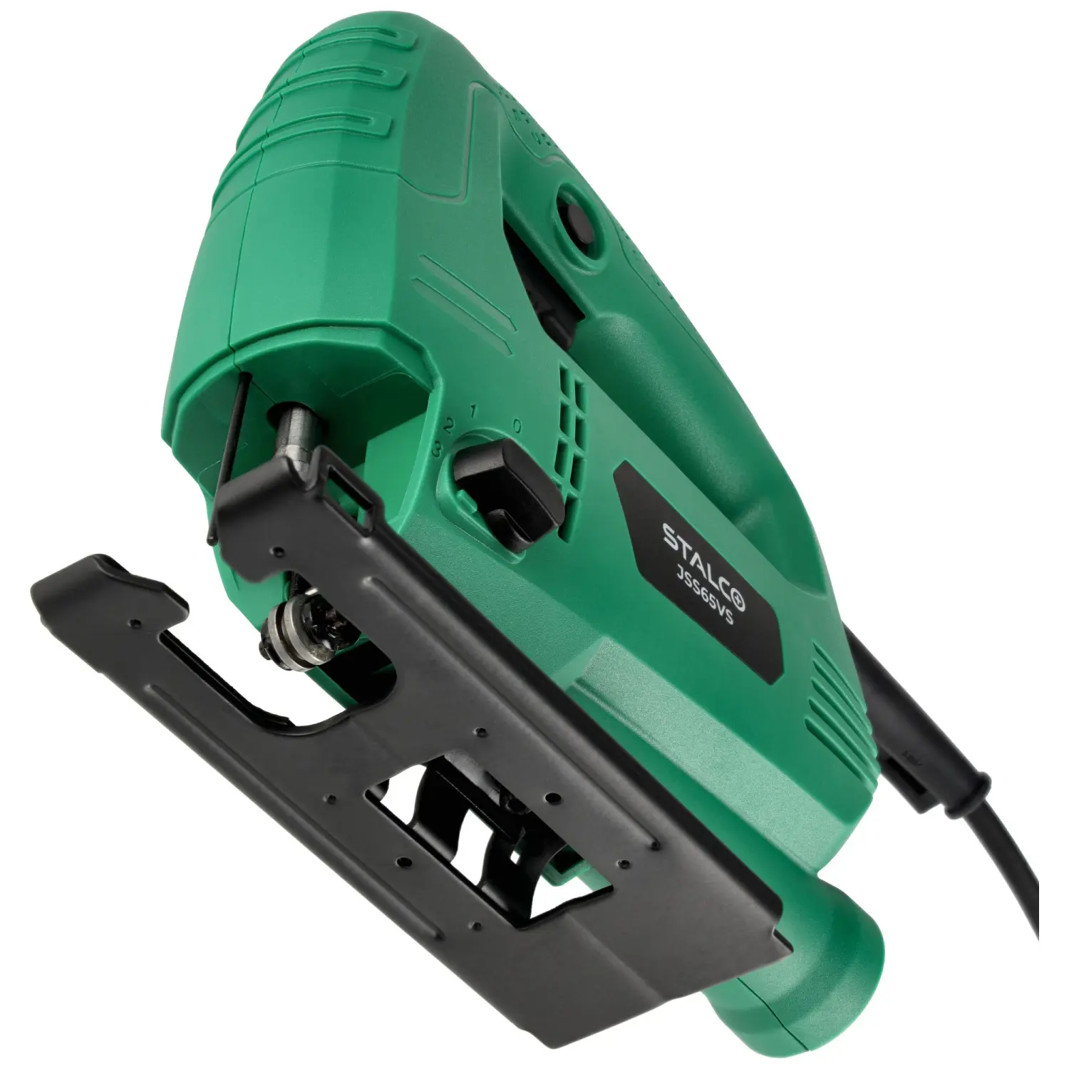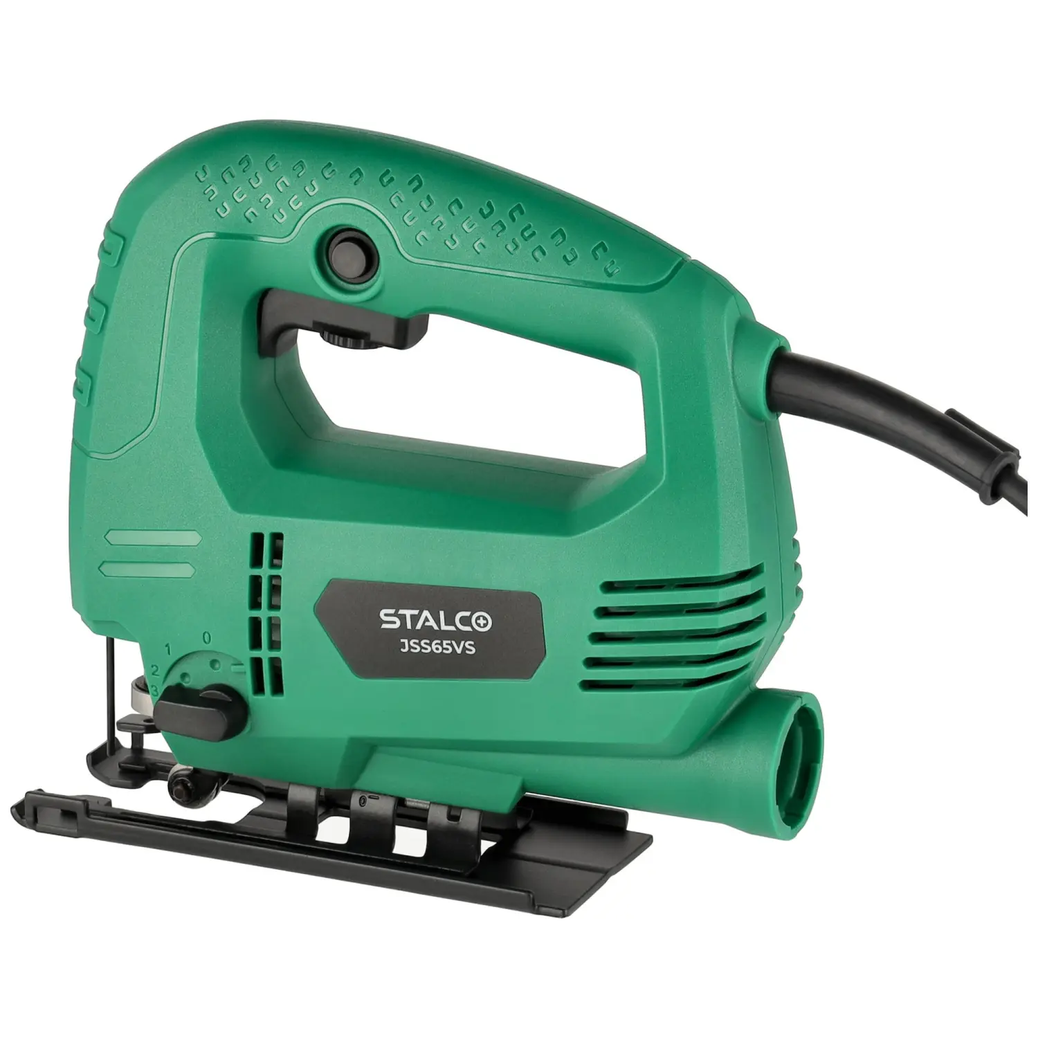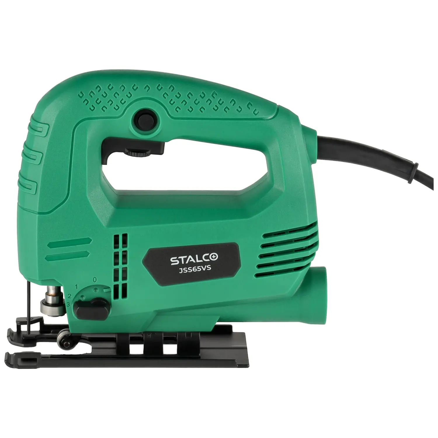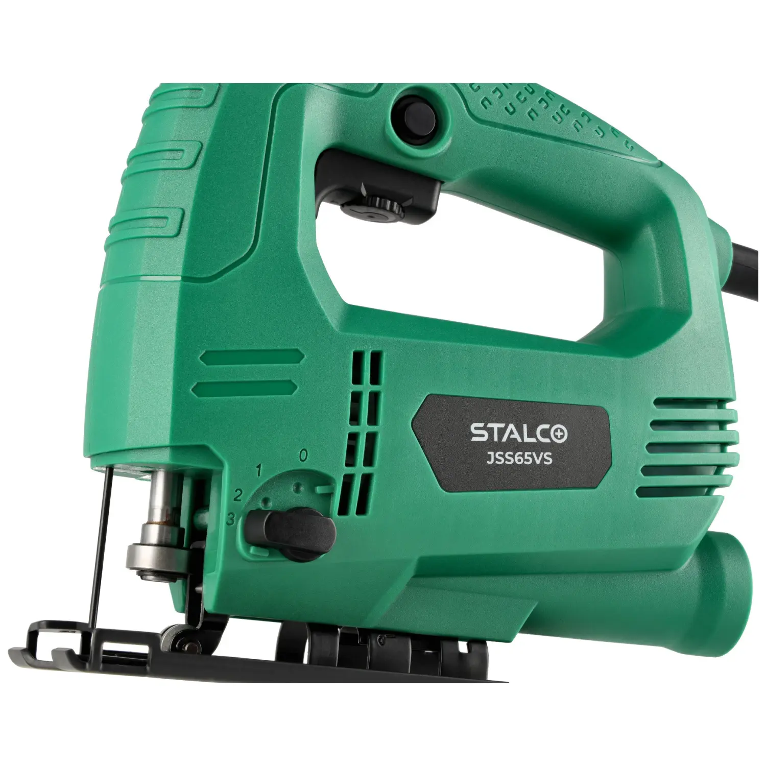 The JSS65VS STALCO jigsaw is equipped with a 550 W motor that allows the blade to move up to 3000 strokes per minute. The stroke speed is controlled by a switch with four selectable settings. The design also includes an adapter port for connecting a vacuum cleaner.