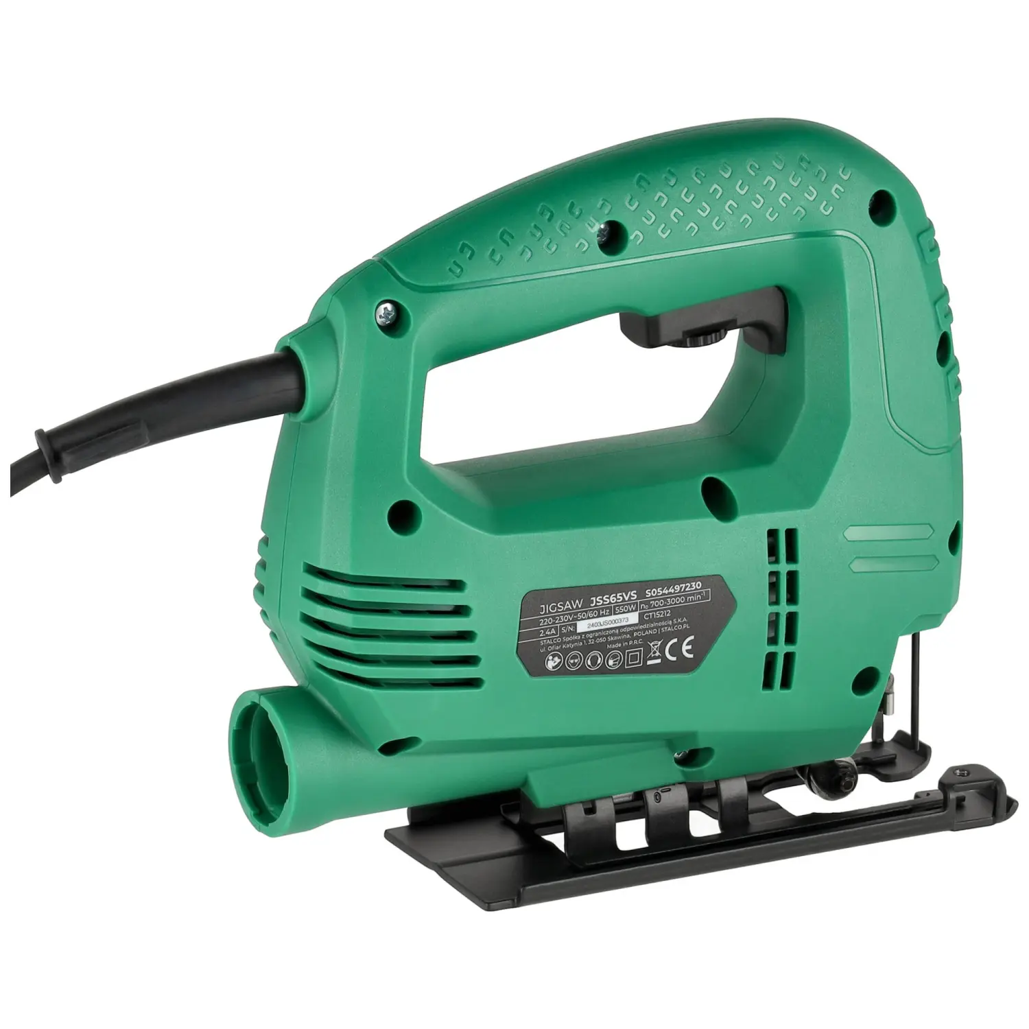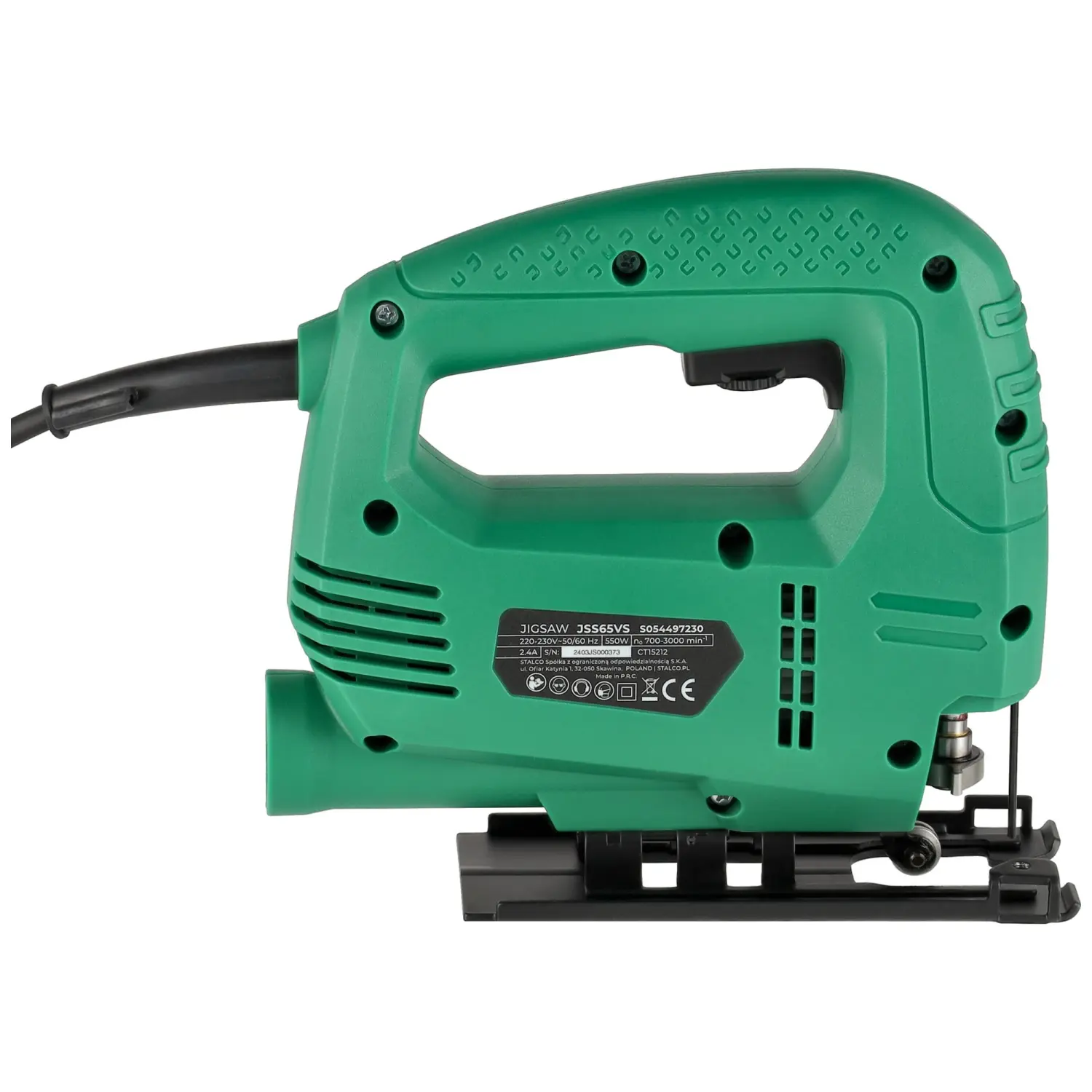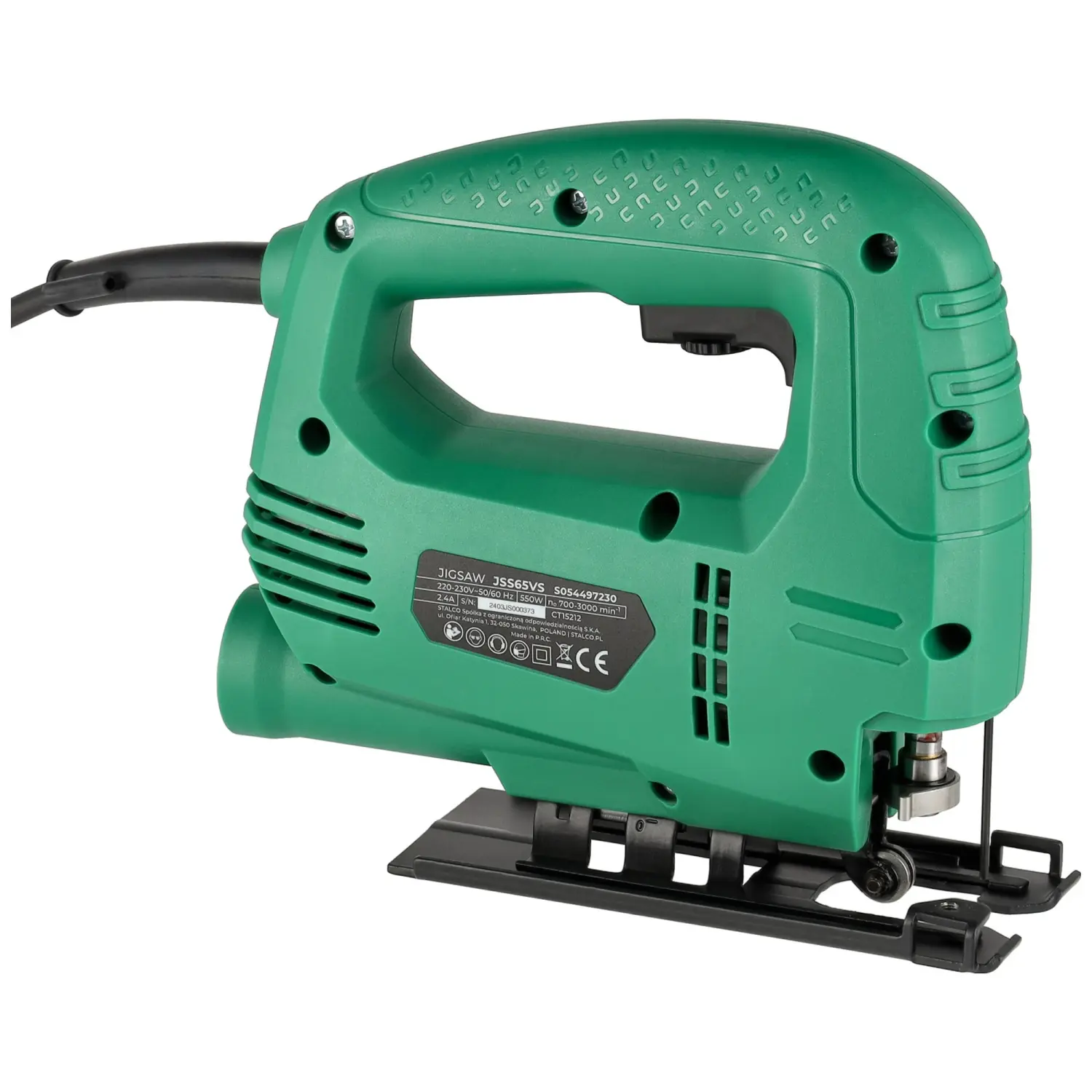 The JSS65VS jigsaw is a popular tool designed for cutting curved lines in various materials. Depending on the blade type, it can be used for rough or precise cutting of wood and wood-based panels up to 65 mm thick, as well as sheet metal, plastics, and many other construction materials.