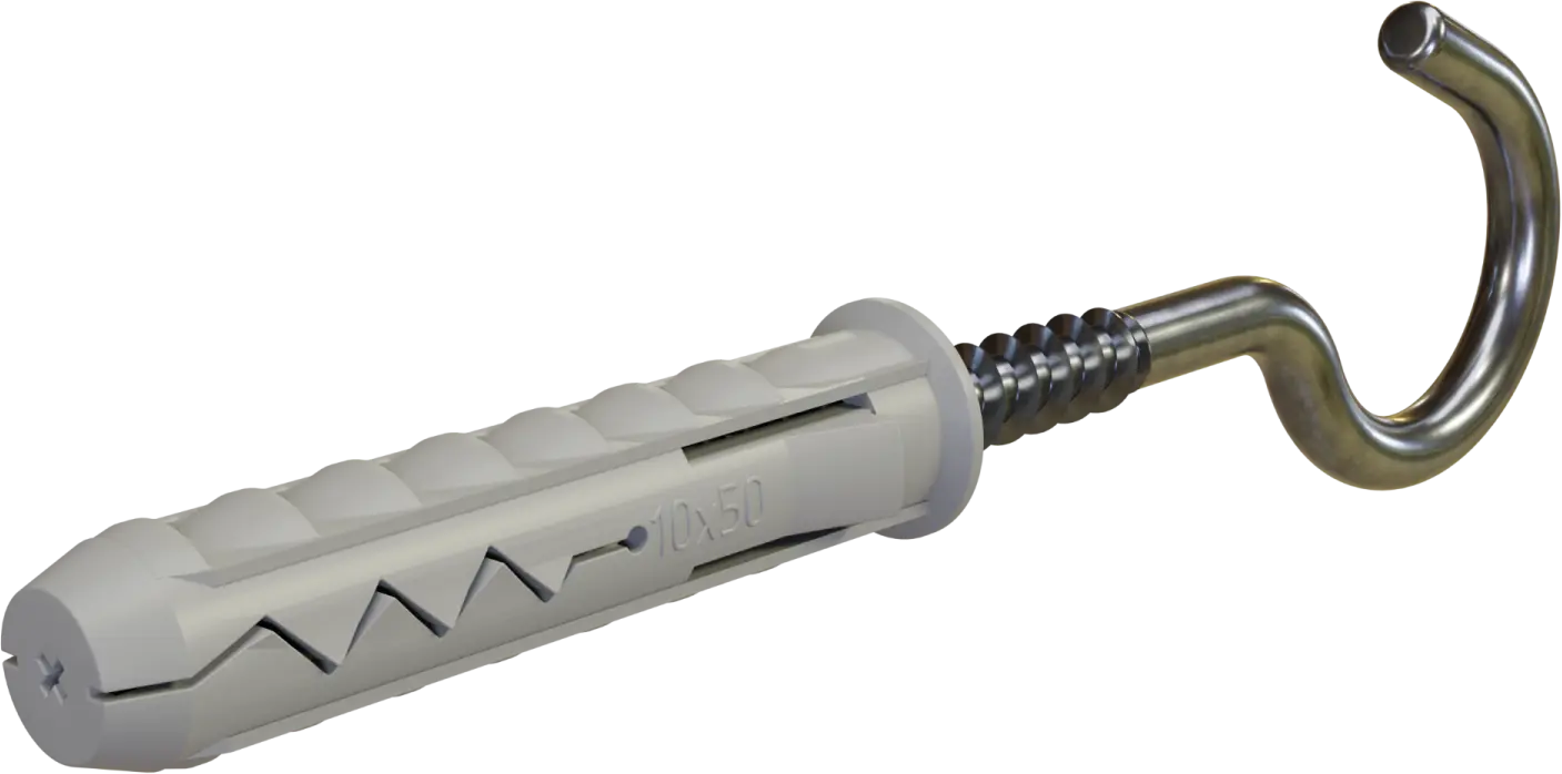 The ceiling hook expansion plug is used in construction and assembly work. It consists of a polypropylene sleeve of a suitable design that expands inside the hole. The screw is made of electro-galvanized steel and terminated with a semi-circular hook.