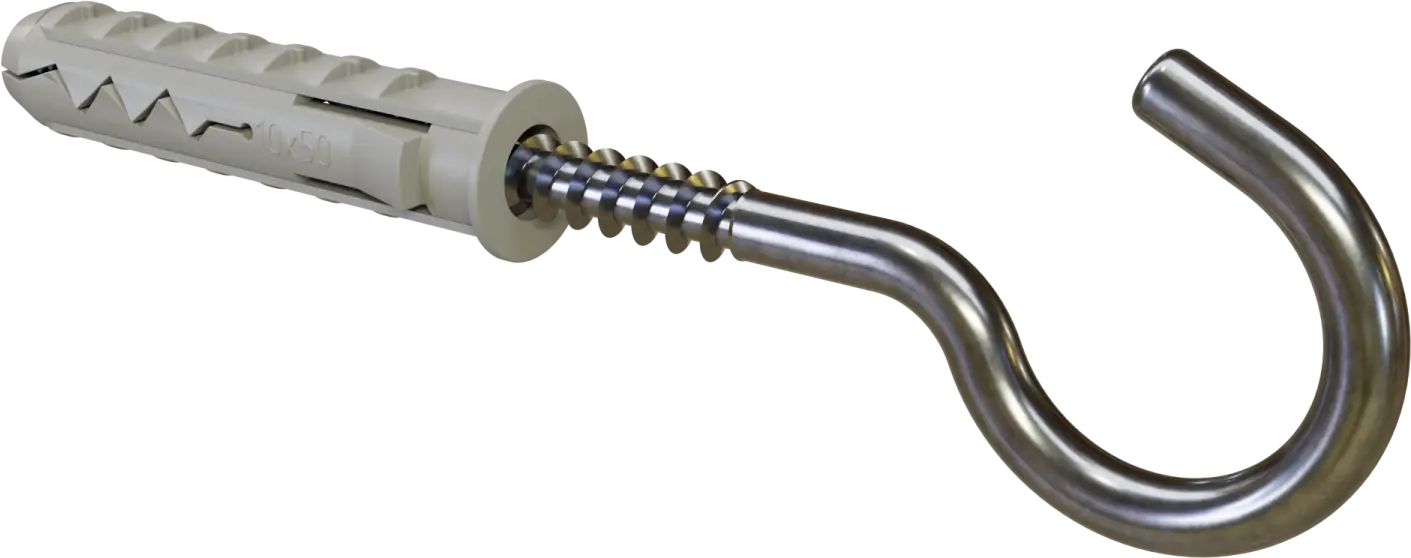 The ceiling hook expansion plug is used in construction and assembly work. It consists of a polypropylene sleeve of a suitable design that expands inside the hole. The screw is made of electro-galvanized steel and terminated with a semi-circular hook.