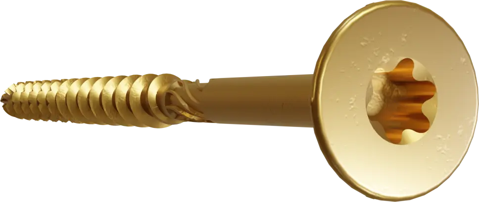 The TORX socket allows for secure insertion of bits installed in power tools. The screw's design prevents splitting of the wood, and the head forms a flush fit with the material. The screw is available in several diameters ranging from 3 to 6 mm and can be operated with TORX keys from T10 to T25. In turn, its length can be from 16 to 260 mm.