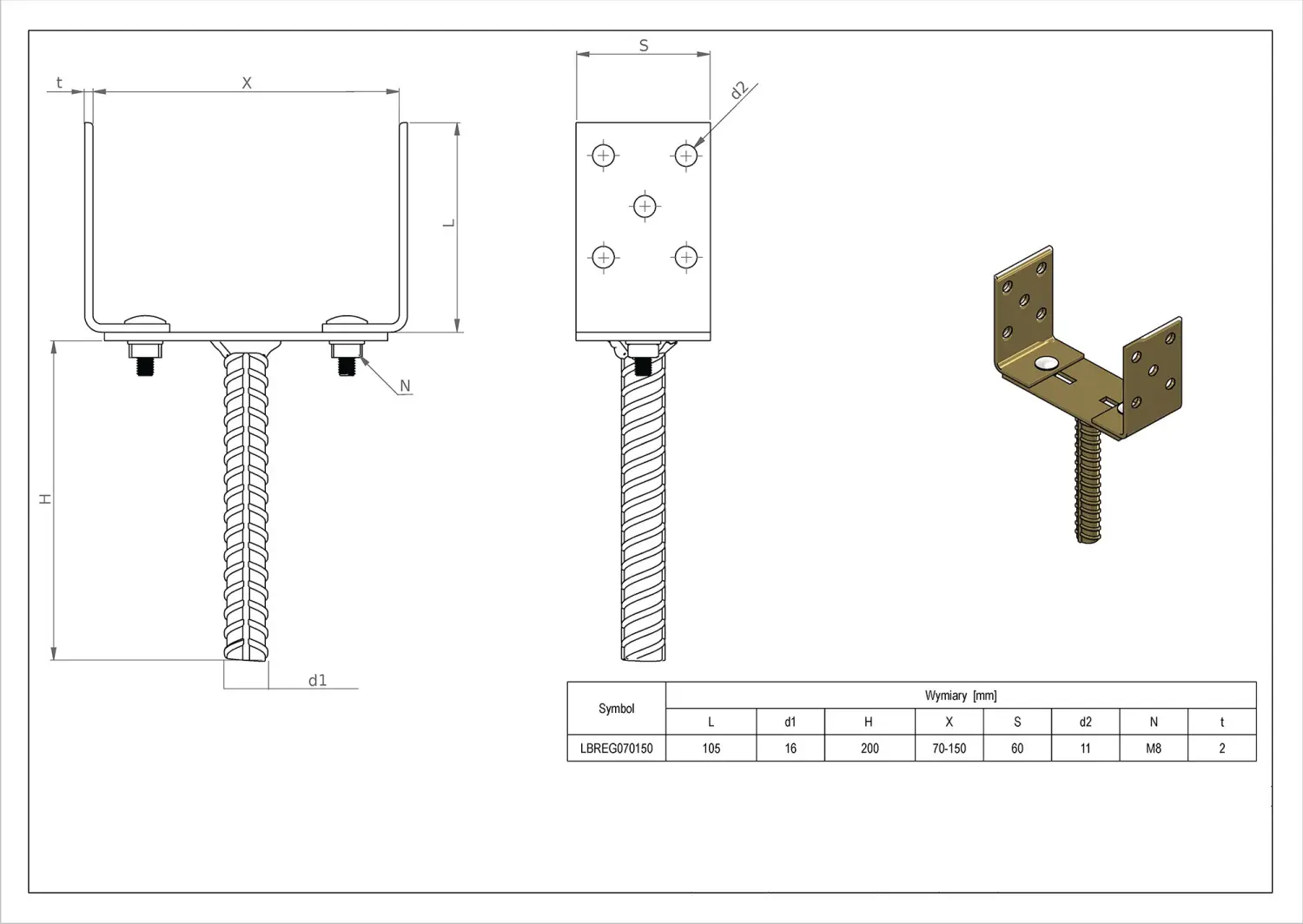 The beam connector enables the pole to be mounted to concrete and provides expansion joints between the wood and the ground. It is made of galvanized steel sheet, a high-strength low-carbon alloy. It consists of a U-shaped bracket to which a ribbed bar is welded, embedded in concrete.