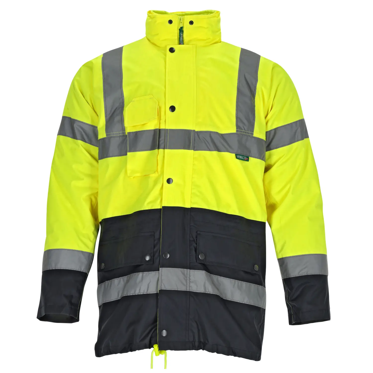 This jacket is high-visibility clothing. It is made of materials in saturated, neon colors with reflective tapes and contrasting inserts. All this is designed to ensure visibility during work performed both during the day and after dusk and to increase safety at work.
