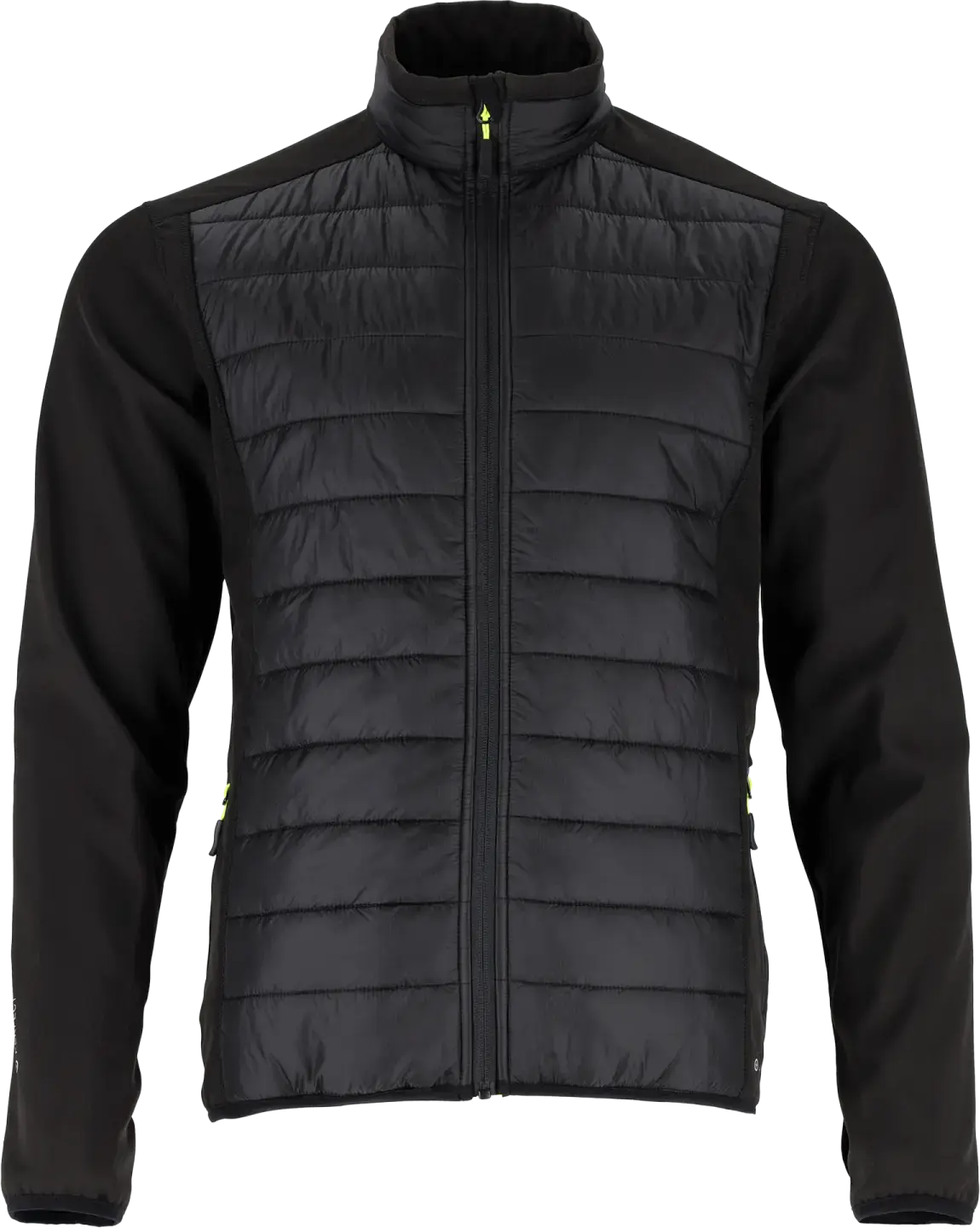 The AUGUST M men's hybrid sweatshirt is made of two types of materials. The first is a softshell fabric with good durability and a quick drying time. The fabric is moisture-resistant and easy to keep clean. The second part is a down insulation, and the fabric is quilted in this area.