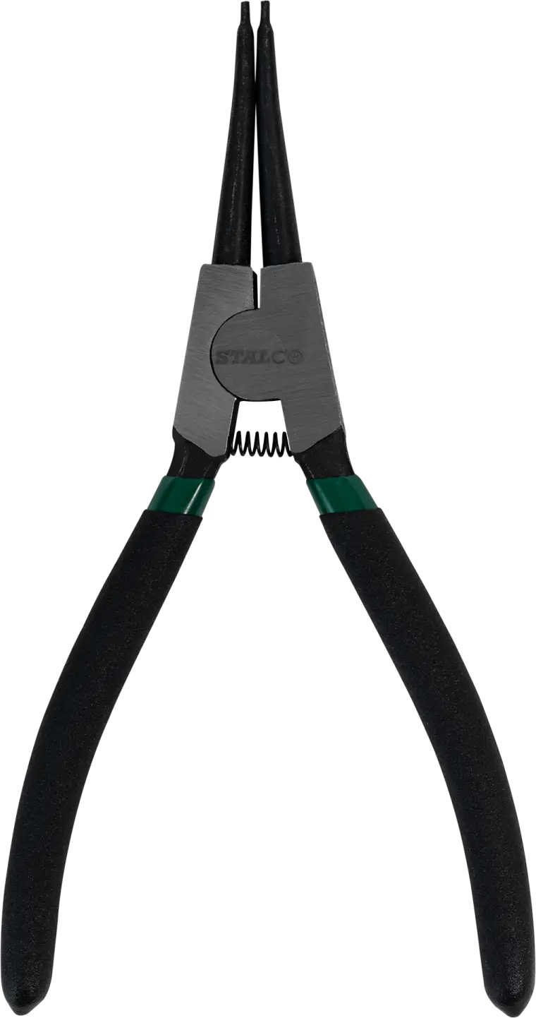 When working with circlips, you'll need straight external Seeger pliers. The tools are designed with these components, which are primarily used in the automotive industry, in mind. The straight jaws are made of carbon steel. This material ensures tool durability and minimizes tip deformation. Straight external Seeger pliers have soft-grip handles, making them comfortable to use. STALCO also offers tools for circlips, but with a different jaw design.