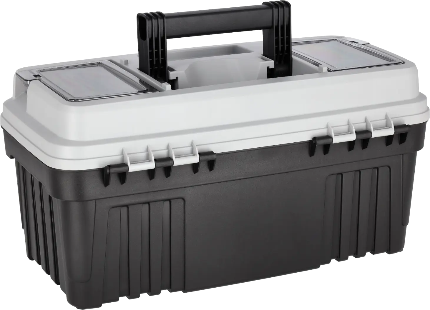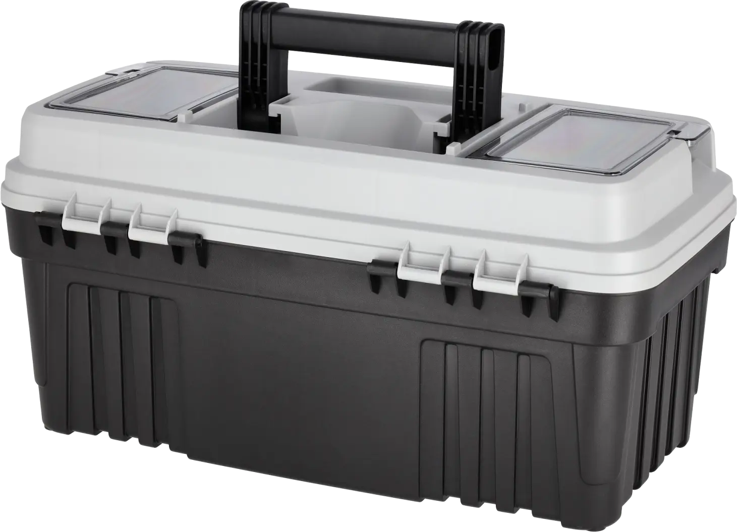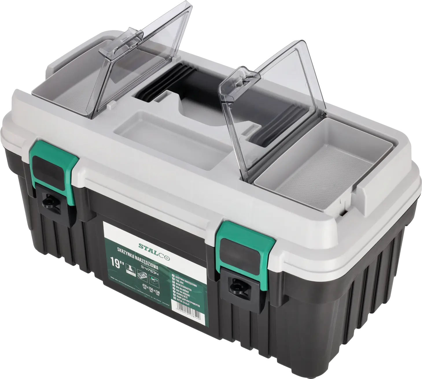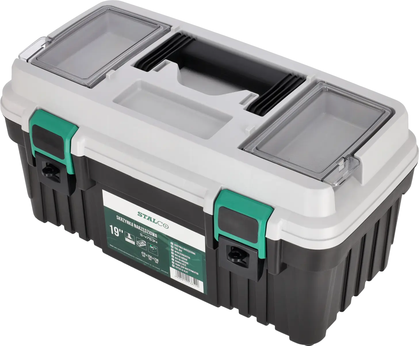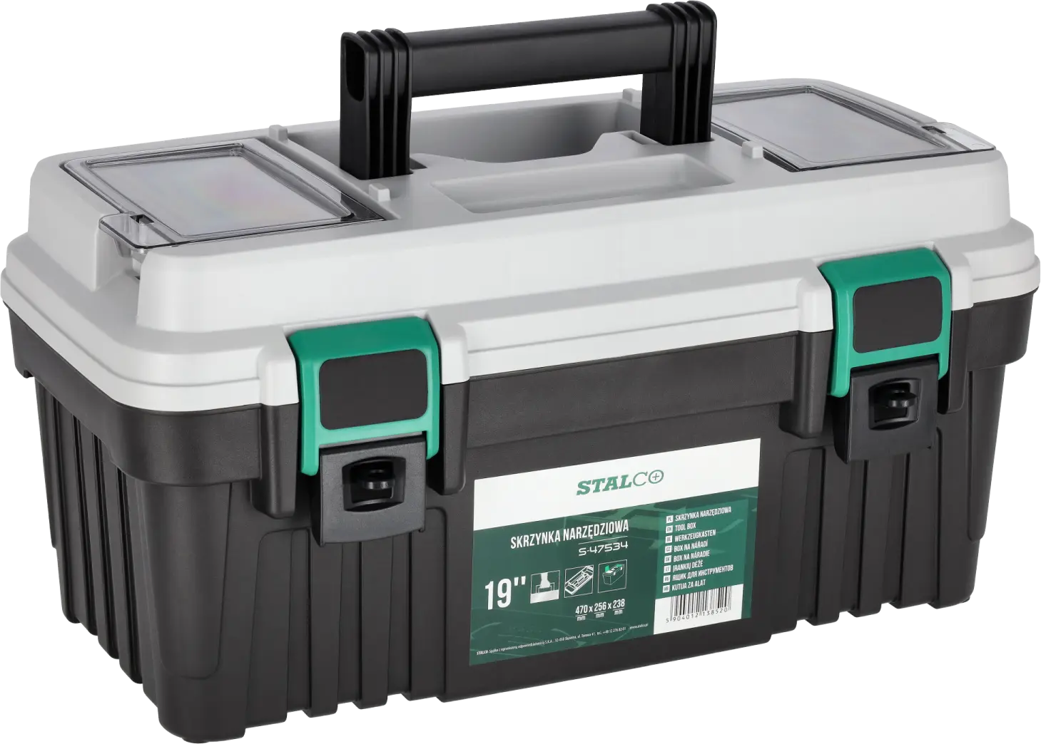 The universal 19" plastic toolbox is a very functional piece of equipment. It is made of plastic, which ensures its low weight and protects the contents well. It is mainly suitable for amateur use. It can be useful in home workshops, garages, and also as a container for carrying tools during field work. It has dimensions of 470x256x238 mm and a load capacity of up to 13 kilograms, so it is sufficient for carrying the most necessary tools. The STALCO plastic toolbox has a spacious main compartment for storing larger items. Inside, there is a pull-out lid, which will provide plenty of space for the most important tools. Two transparent organizers located in the upper part of the lid can be used to store the smallest items. The lid itself is closed with two durable two-component fasteners that secure the contents. An ergonomically shaped plastic handle is used for carrying.