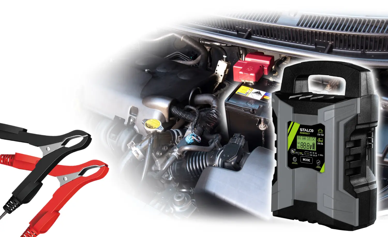 The STALCO PERFECT PowerPulse 15A Car Charger is a powerful, microprocessor-controlled device, ideal for charging a variety of batteries including WET, MF, GEL, AGM, EFB, and LFP. It features a fully automatic 6-step charging process that adapts parameters to the battery, ensuring long life and efficiency. With the DC power supply function, it can also act as a stable power source.
