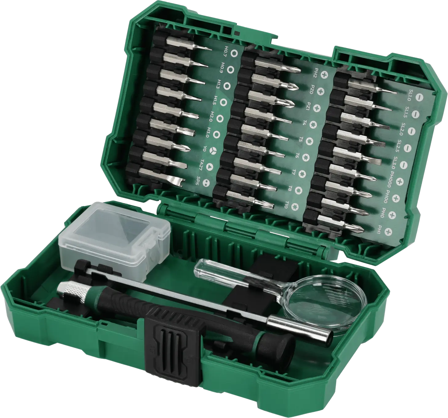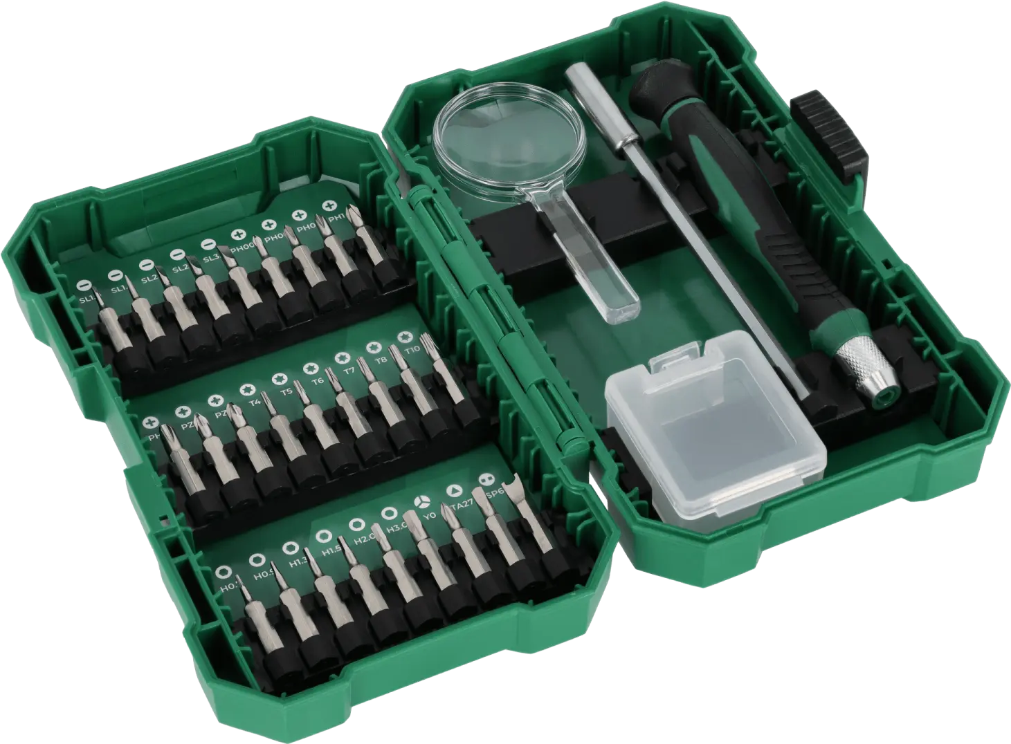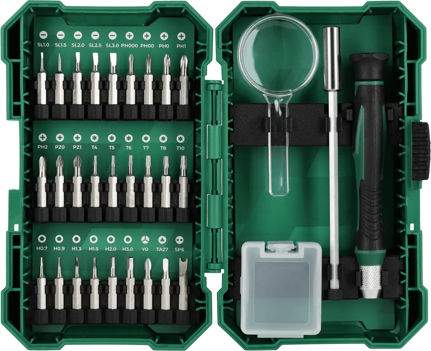 The 1/4-inch precision bit and accessory set is a complete set of specialized tool accessories. It includes accessories useful for working with small screws and bolts. It will be indispensable for tasks in the electronics industry, modeling, and minor repairs. It contains over 20 bits in various sizes. They can be operated with the included manual screwdriver. The set also includes a magnifying glass and several additional accessories to facilitate precise work. The STALCO quarter-inch precision bit and accessory set will be useful for a variety of tasks. The bits are formed from S2 steel, which is highly durable and resistant to damage. The bits will retain their shape and size, preventing them from damaging screw holes. All the set components are housed in a resealable plastic case for easy organization and transport.