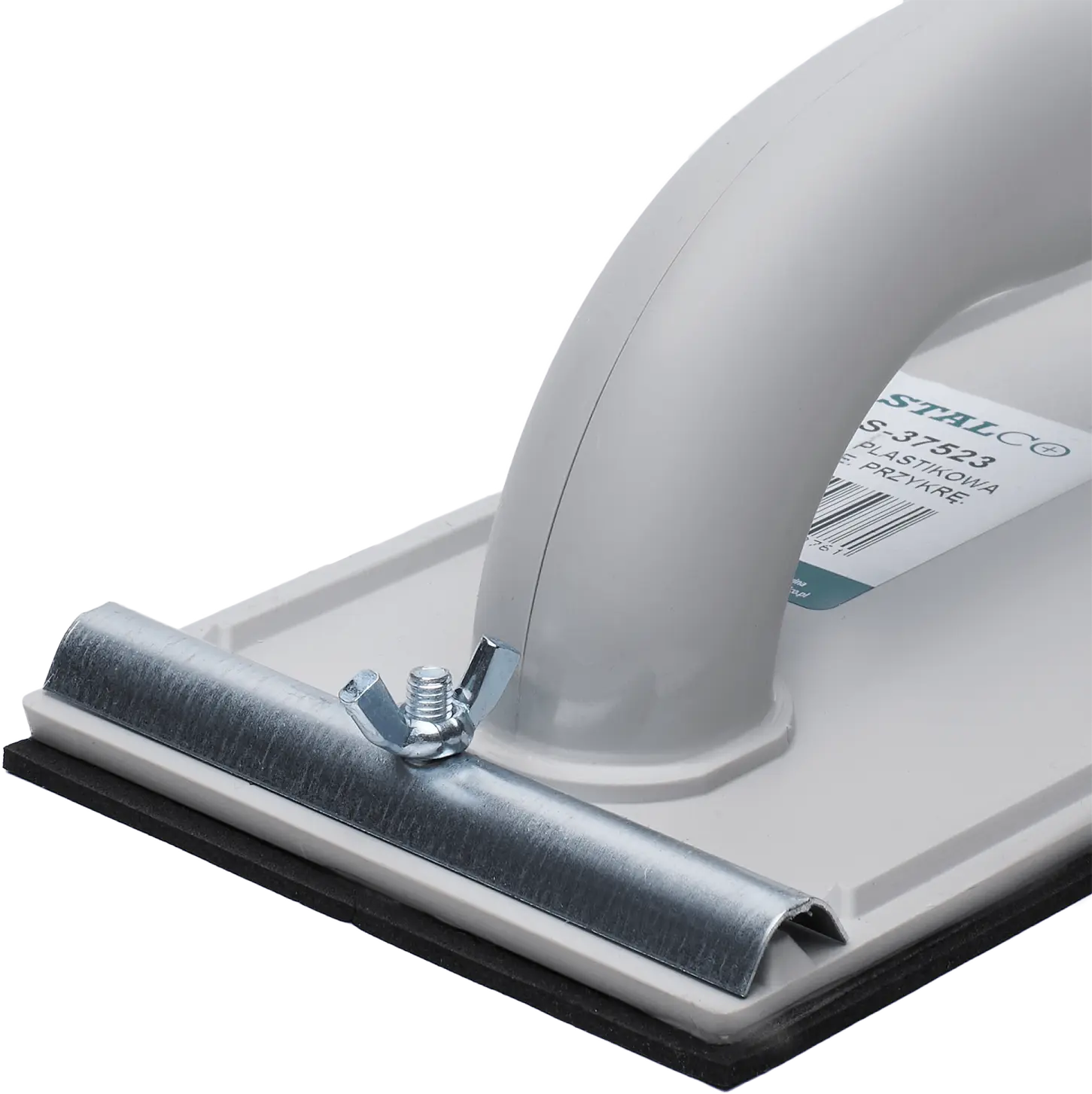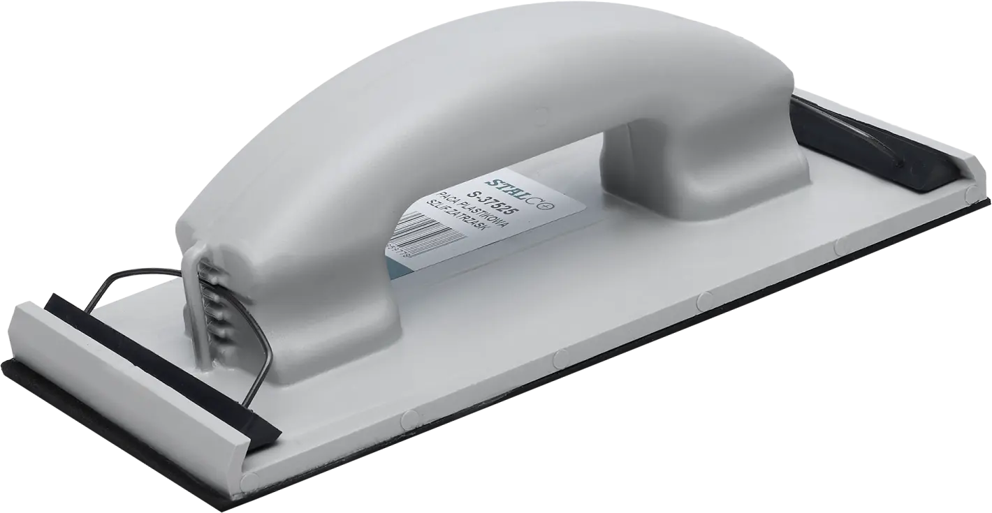 The universal PVC sanding trowel is a tool used in construction work. It is useful for both professional and amateur use. It is designed for preparing surfaces for paint finishes. It is used for wiping off excess plaster and leveling the surface for further finishing work. The PVC sanding trowel has a body made of solid plastic. Abrasives can be mounted on a rubber pad. They are secured using latches or butterfly screws. This allows for very quick accessory changes and selection of the most convenient tool version.