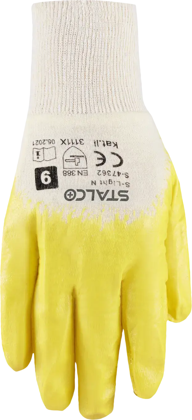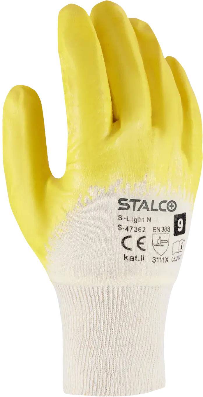 S-Light N cotton gloves are made of a lightweight cotton weave. The material is breathable, ensuring great comfort for the hands even during long hours of wear. An additional nitrile coating is applied to the entire palm. This coating protects the hands from contamination with oily substances. It also protects the fingers from cuts and bruises, and increases the grip on smooth surfaces. S-Light N cotton gloves provide Category II personal protective equipment protection and meet the requirements of EN 420 and EN 388. They are available in sizes 8, 9, and 10.