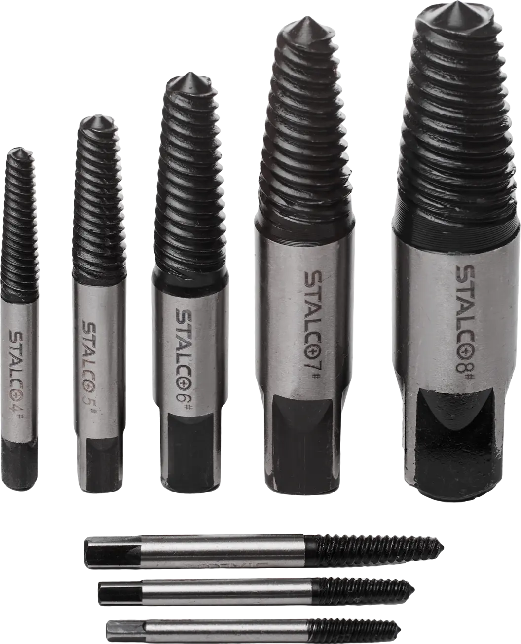 STALCO's robust screw extractors are workshop tools designed to remove screws that can't be removed by any other means. Counter-threaded drill bits are designed for inserting into screws with a stripped head or damaged socket. A socket and hand wrench holder on the other end allows for easy removal. The screw extractors are a set of eight pieces of varying diameters, which you can use for working with various screws. Each piece is housed in a durable case, ensuring you won't lose them in the workshop.