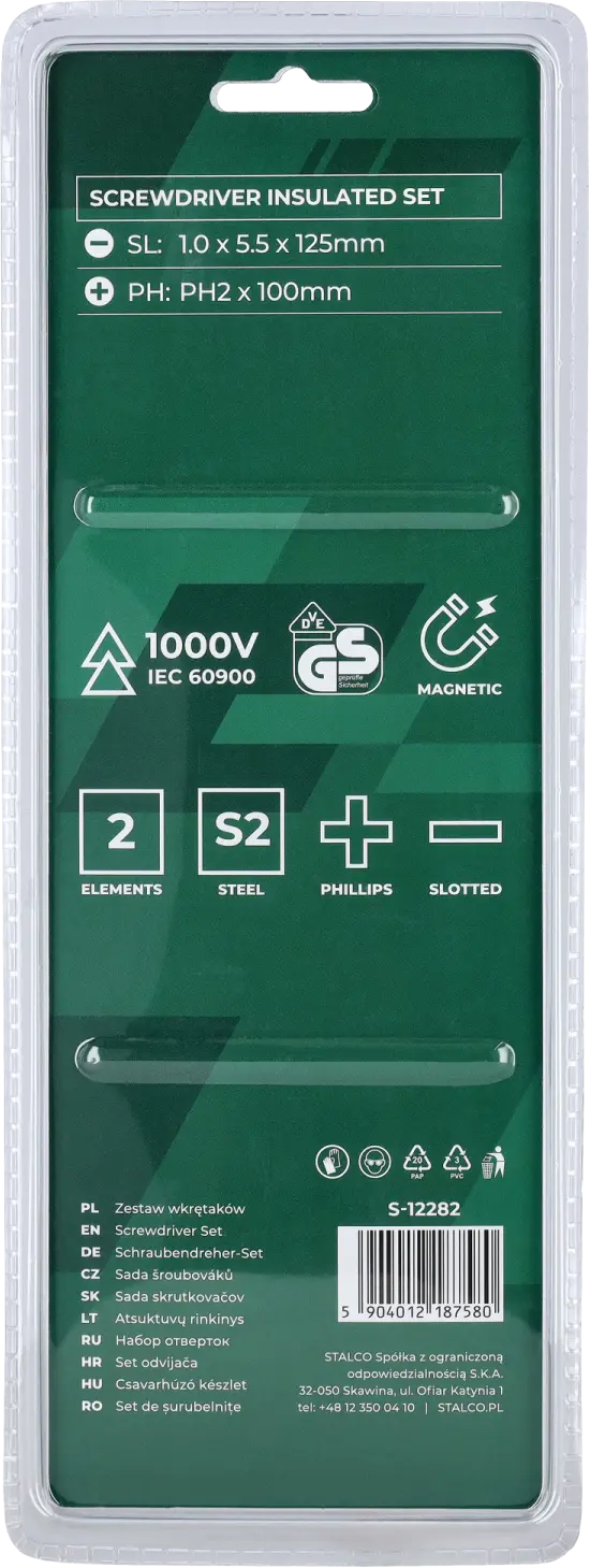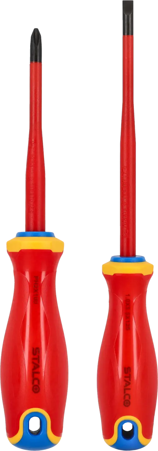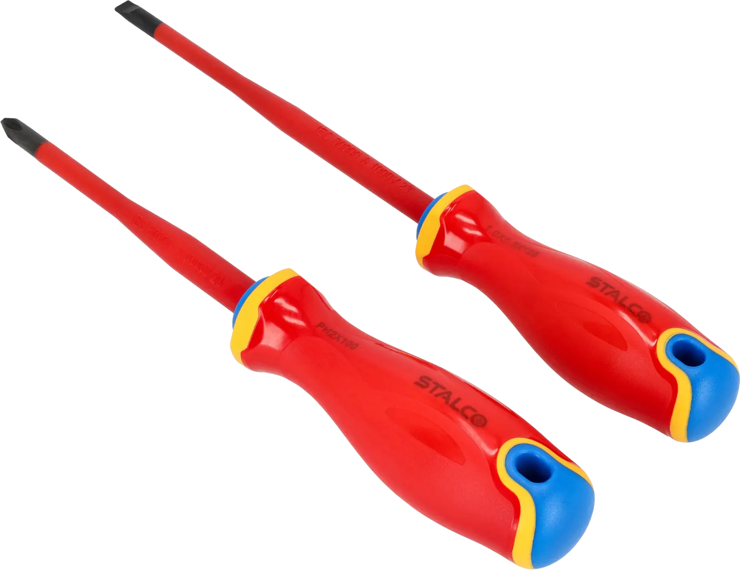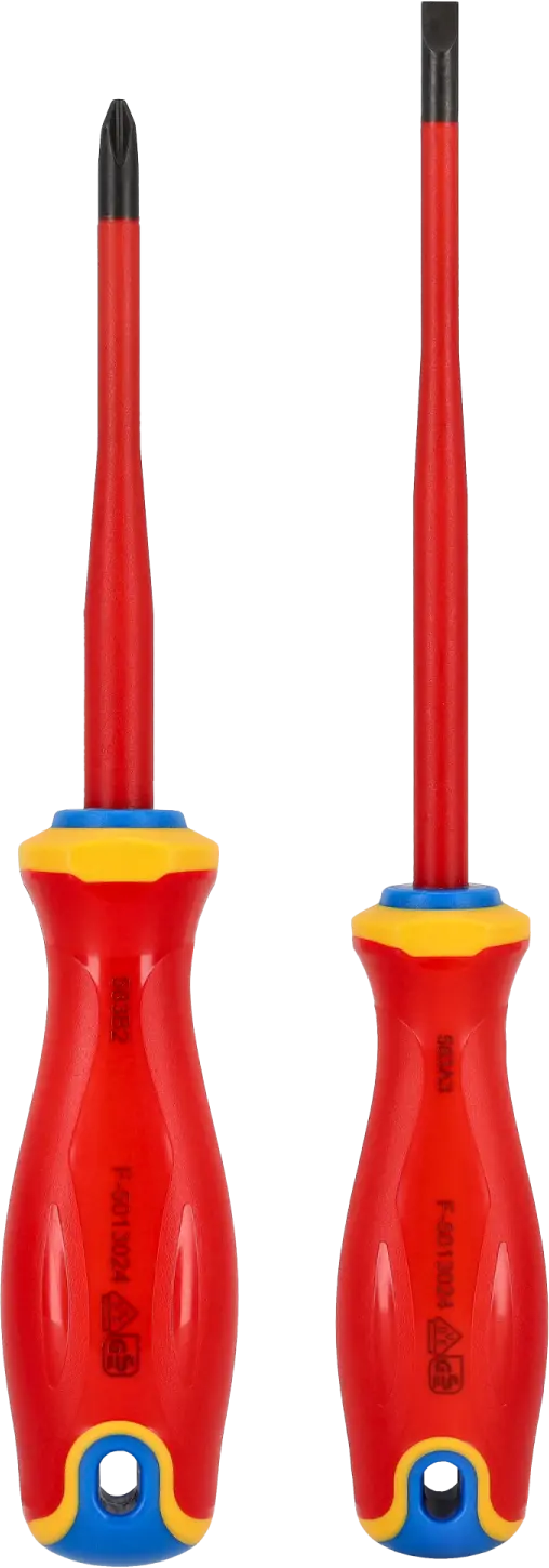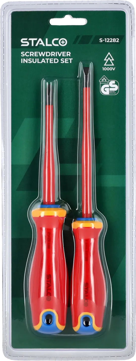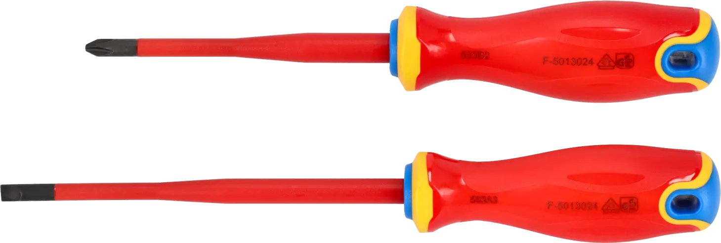 A set of two screwdrivers, certified for use with a voltage of 1000V, equipped with an ergonomic three-material and anti-slip handle, and the screwdriver bits are made of S2 steel.